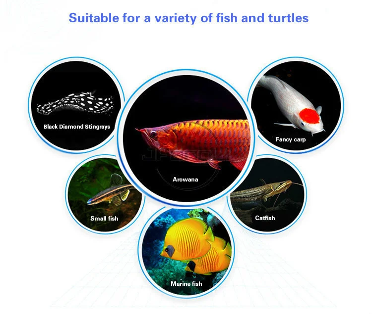 Подходит для различных рыб и черепах: таких как arowana, парча карпа, Золотая рыбка, Красный попугай рыбы, Рохан рыбы, ската, красочная рыба, морская рыба, тропическая рыба, сома, черепаха и т. Д.