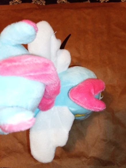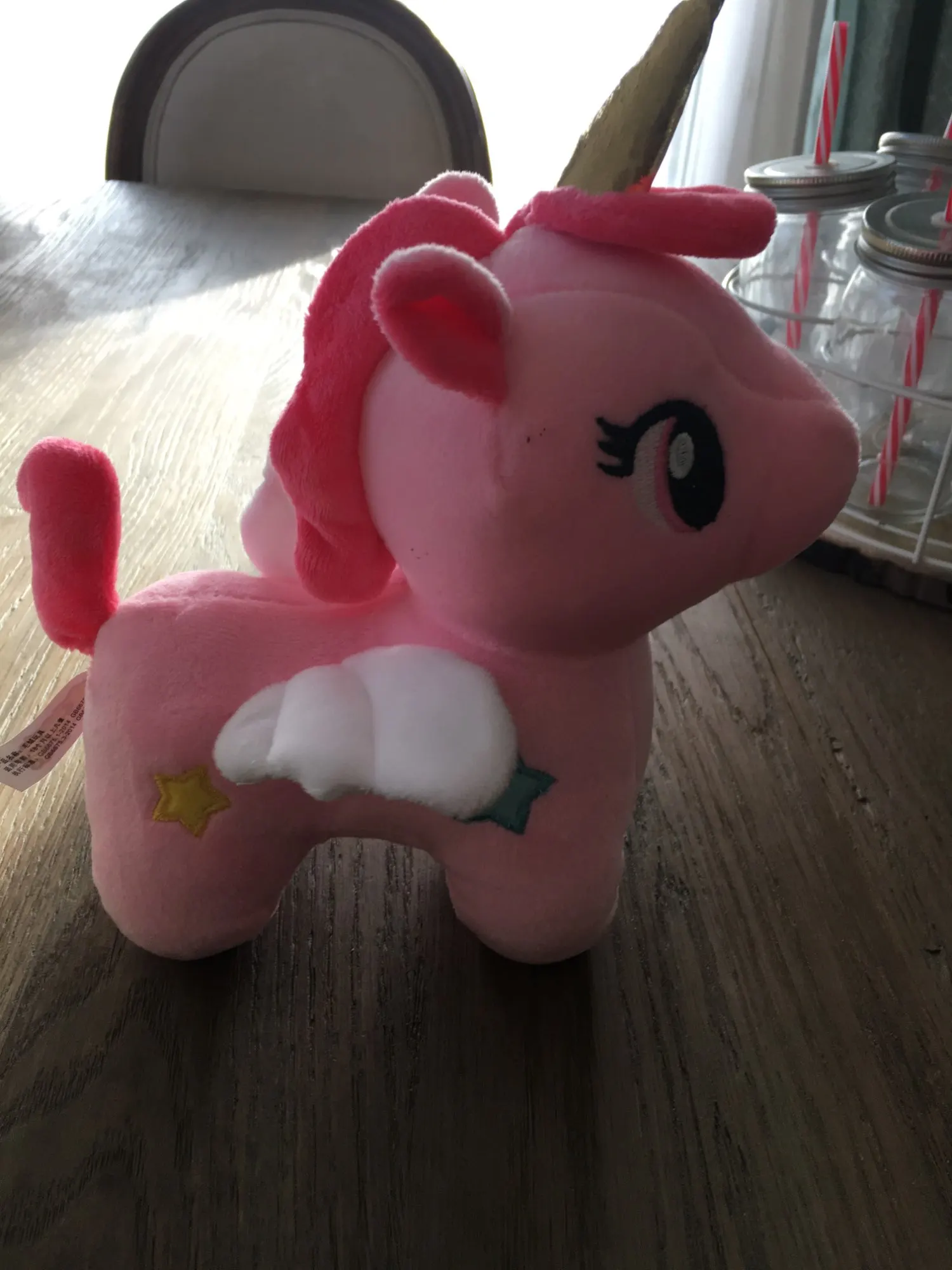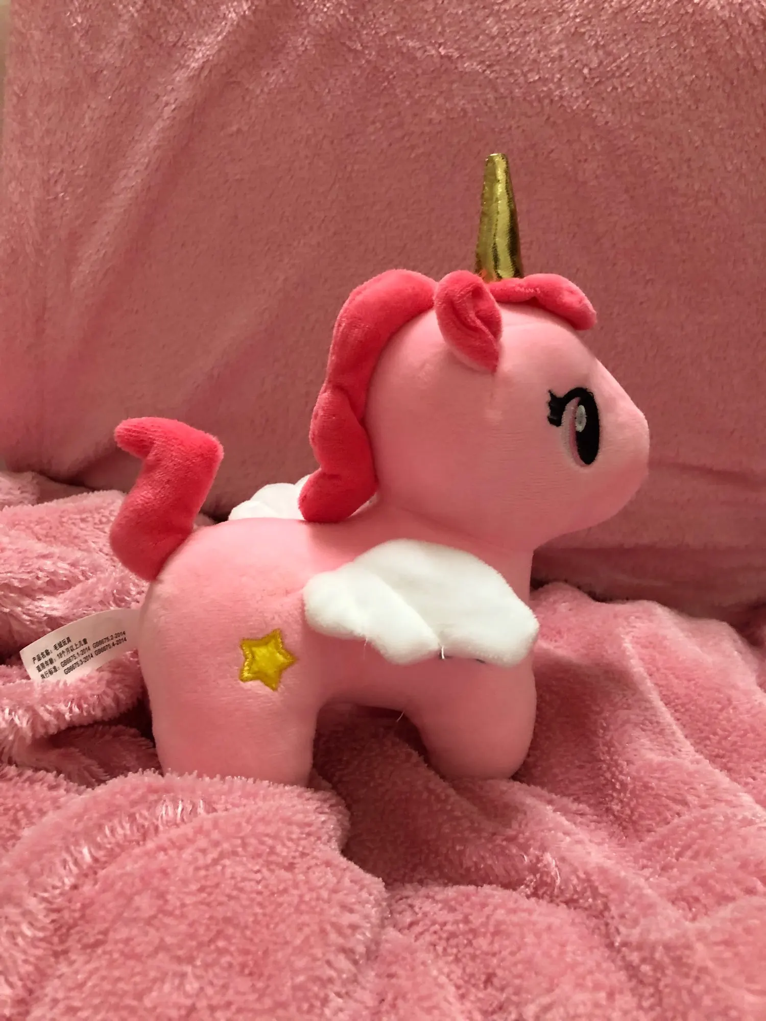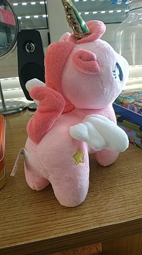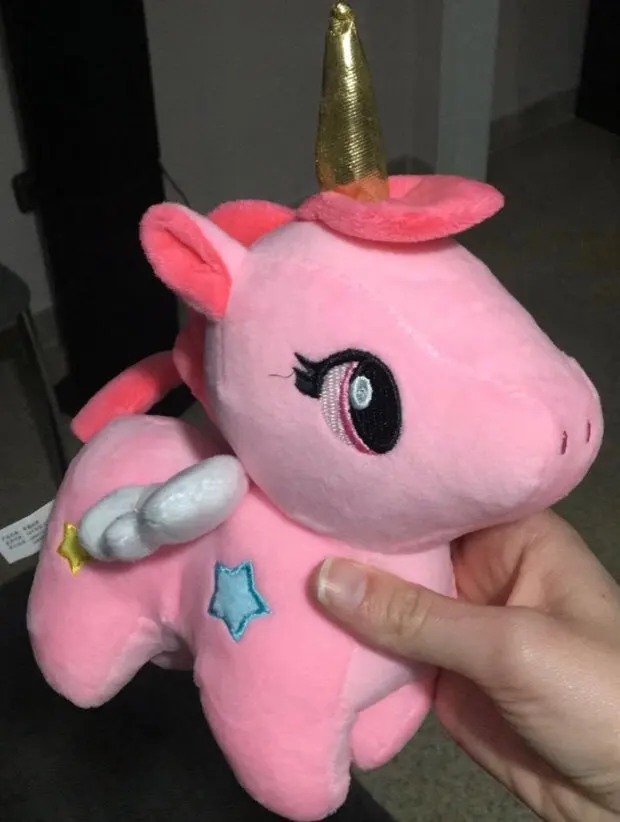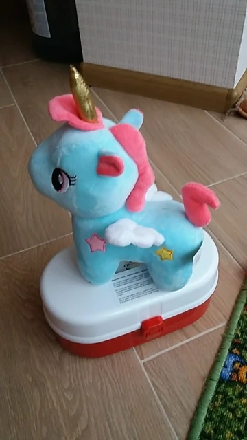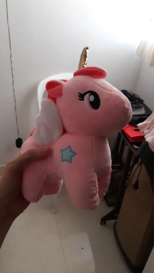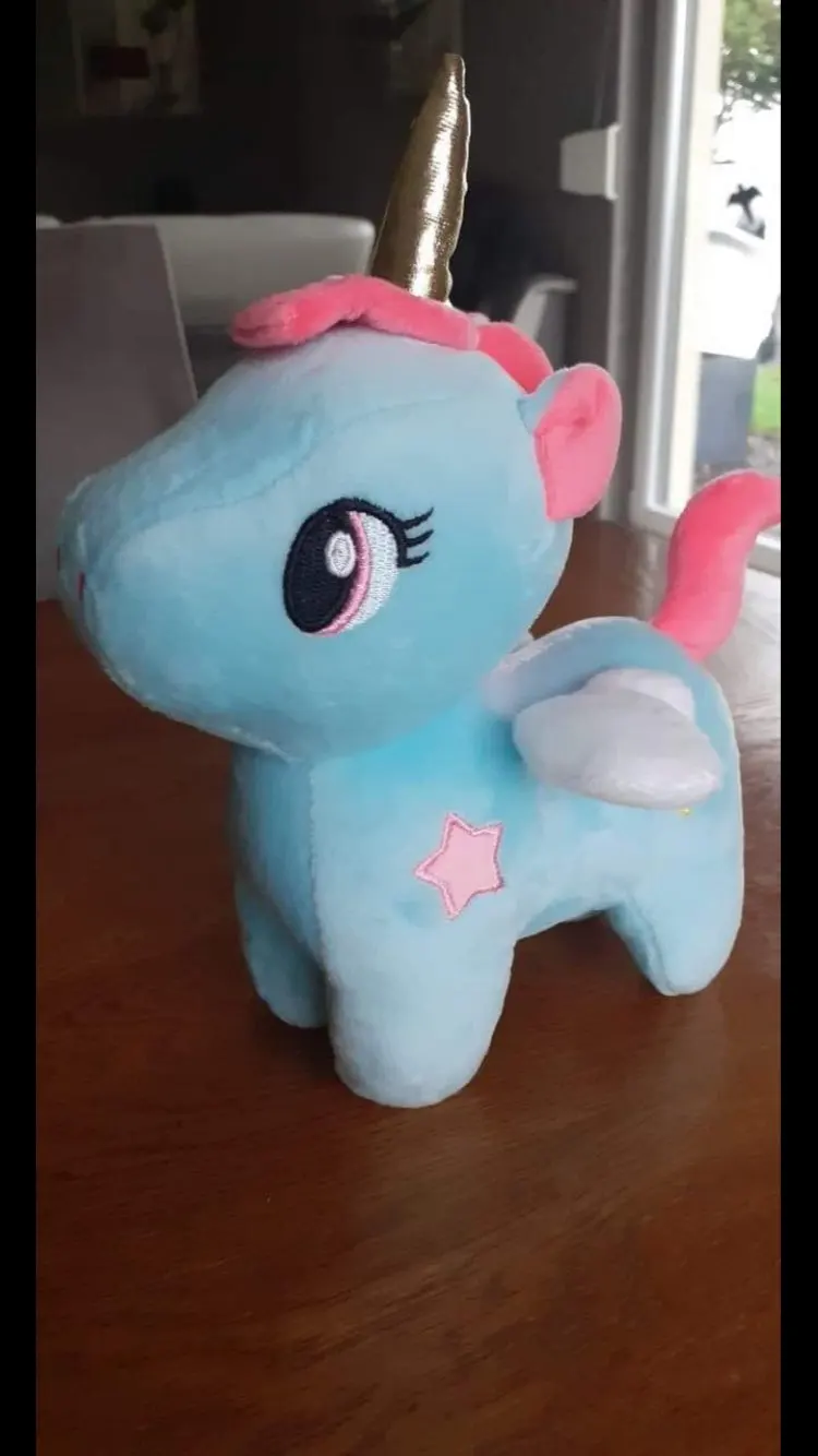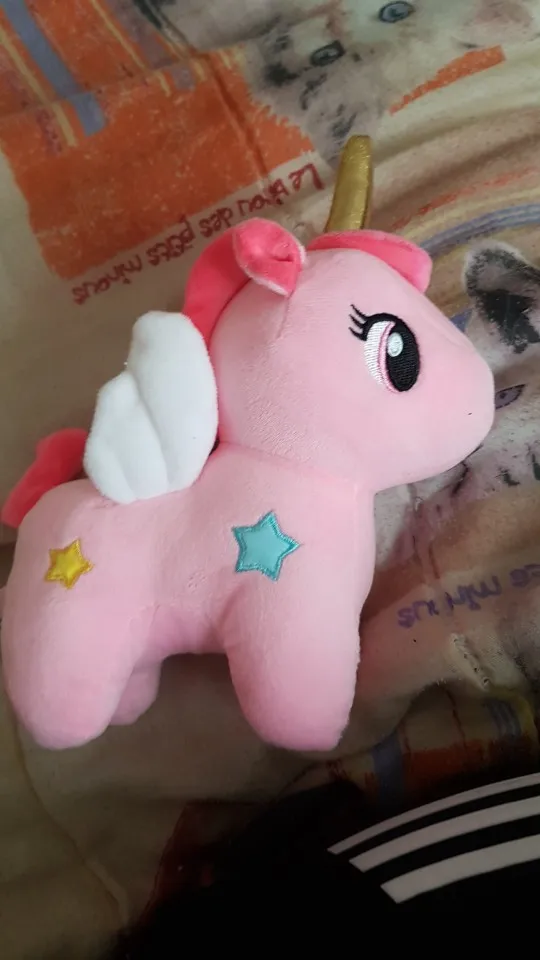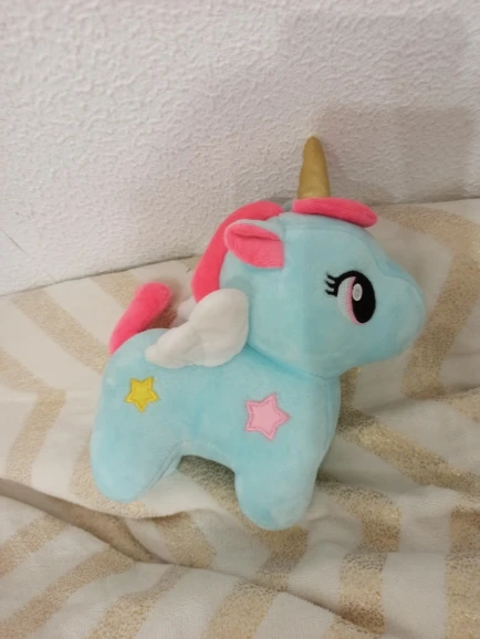 Единорог очень мягкий на ощупь, слишком плохо нет этикеток. В противном случае, она очень красивая.