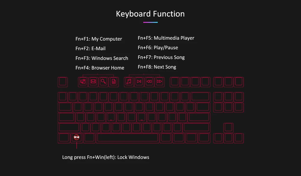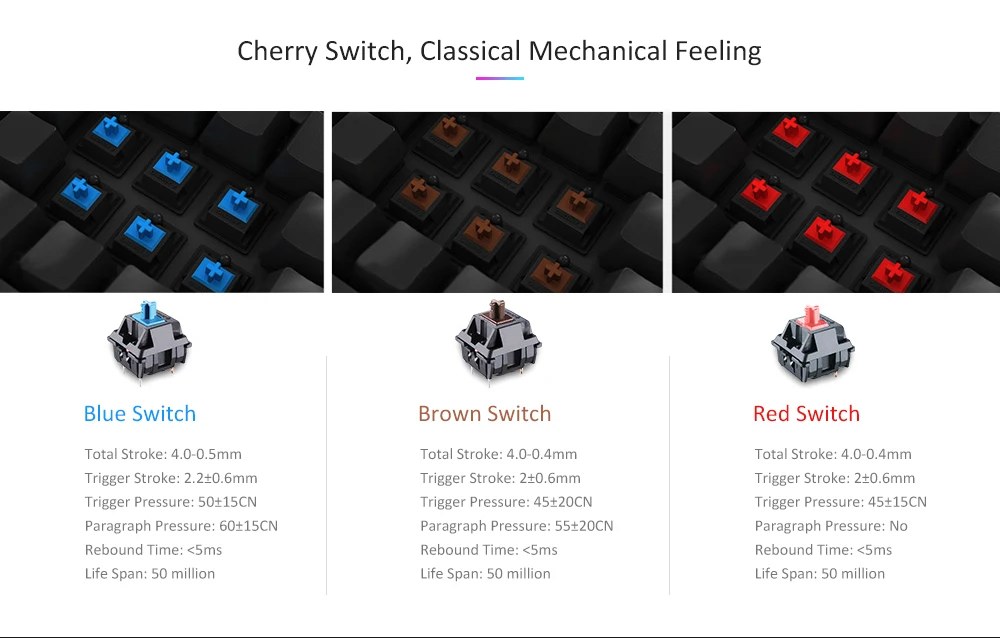 ●Творческие способности надписи клавишиДизайн, легко распознавать ●85% PBT клавиши, Удобное ощущение руки, не легко получить масло ●Съемный кабель type-CДля удобной зарядки и переноски ●Оригинальные Cherry MX Переключатель, Отличная работа ощущения ●6/Все клавиши анти-ореолы режимДля точного ответа в различных условиях ● Поддержка программирования мультимедийных клавиш