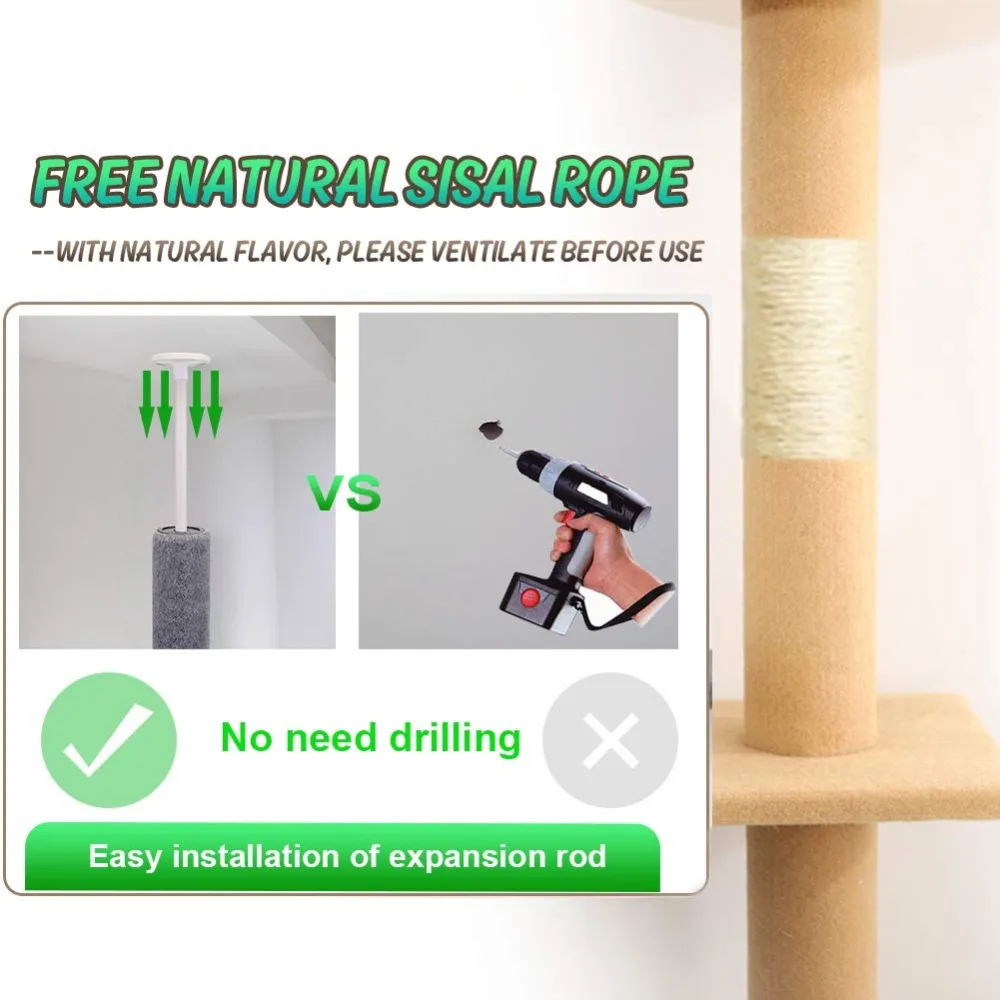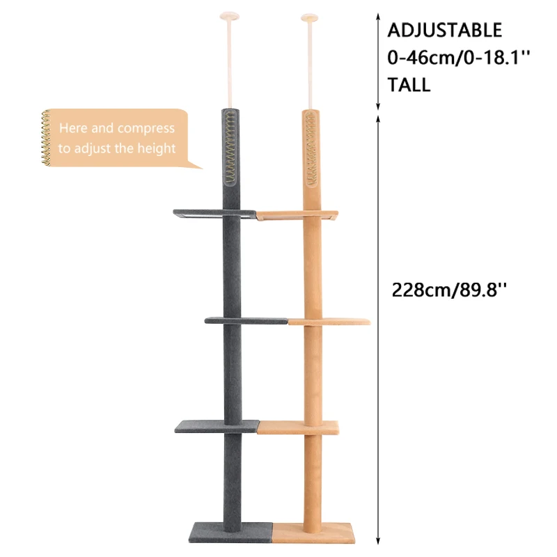 ·Свободное пространство и легко перемещается: когтеточки для кошек не занимают много места и удобны для переноски в любые места, которые вам нравятся: настенный уголок, балкон, гостиная, спальня. Натяжной стержень сверху можно отрегулировать на предпочтительную высоту от высокого до медленного размещения комнатного потолка. Не беспокойтесь о перемещении в нижнюю комнату или размещении на балконе с платформой.