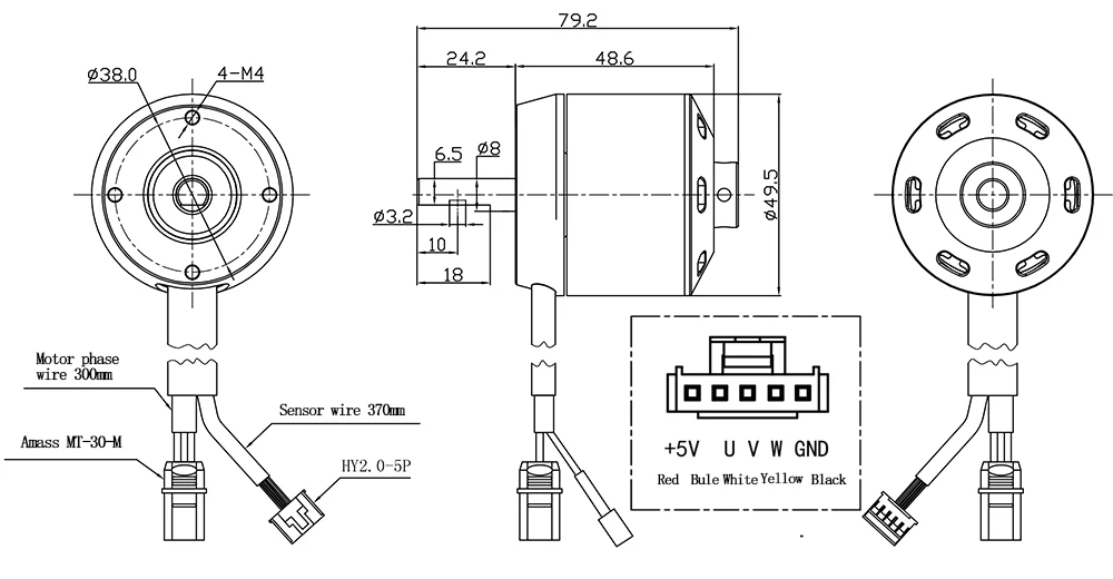 Провод двигателя: 300 мм силиконовый 16AWG провод с MT30 штекерным соединителем.