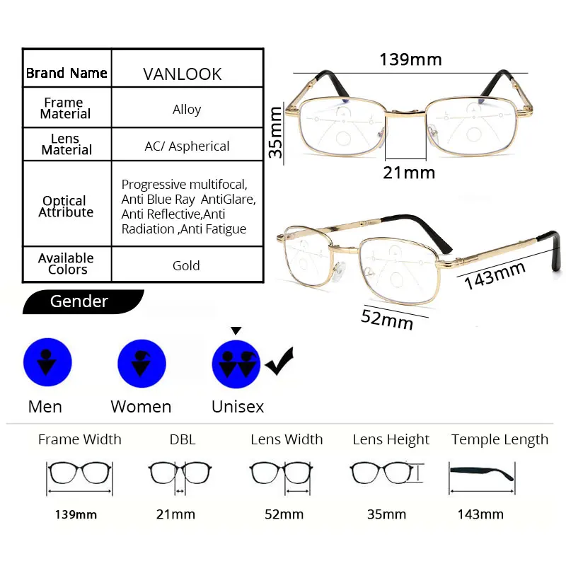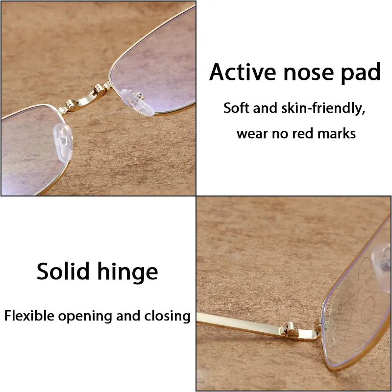 Особенности: 1. Складные очки для чтения с линзы для работы за компьютером 2. Складной дизайн 3. Высококачественная рама из сплава, светильник 4. Заводская цена 5. Модные стильные Компьютерные очки для дальнозоркости 6. Унисекс, оправа для мужчин или женщин, подходит для влюбленных, пар 7. Многофокальные прогрессивные очки для чтения; Анти-излучение, анти-голубой луч, антибликовое, антибликовое, Анти-усталость Технические характеристики: Материал оправы очков: металлический сплав Материал линз: акрил, пластик, асферические линзы Цвет оправы очков: золотистый Цвет линз: прозрачные линзы со слегка синим покрытием