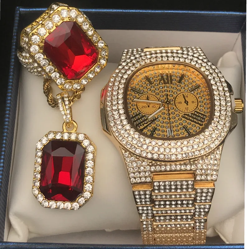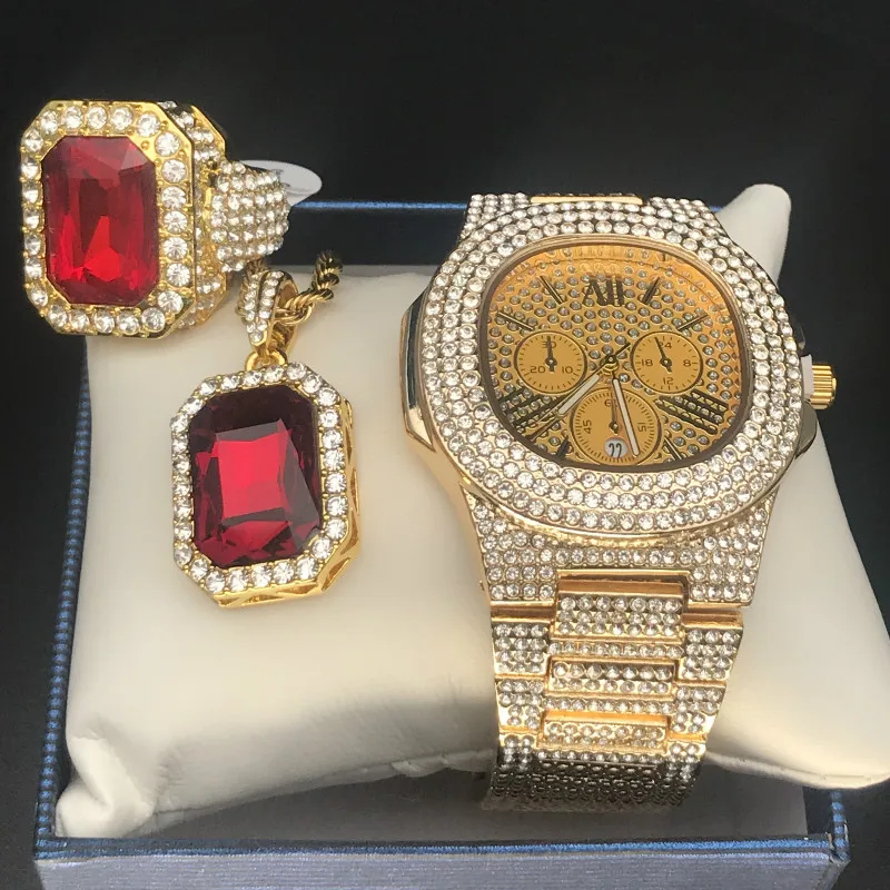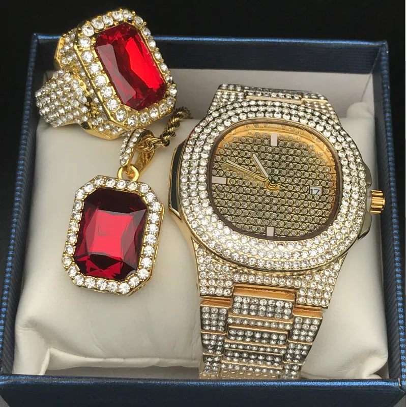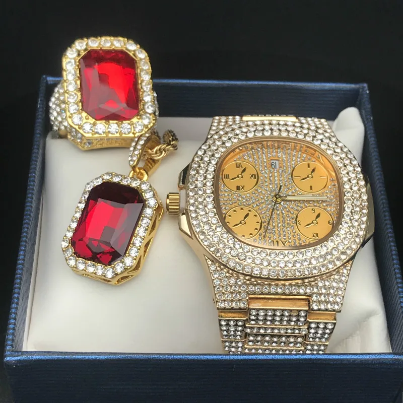 Роскошные мужские часы золотистого цвета, красное ожерелье и кольцо, комбинированный набор часов, Кристальное Ожерелье Майями, ожерелье, рэпер, лед, кубинское, хип-хоп, для мужчин