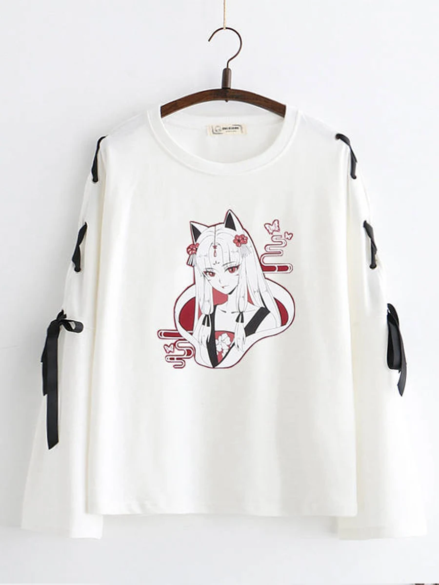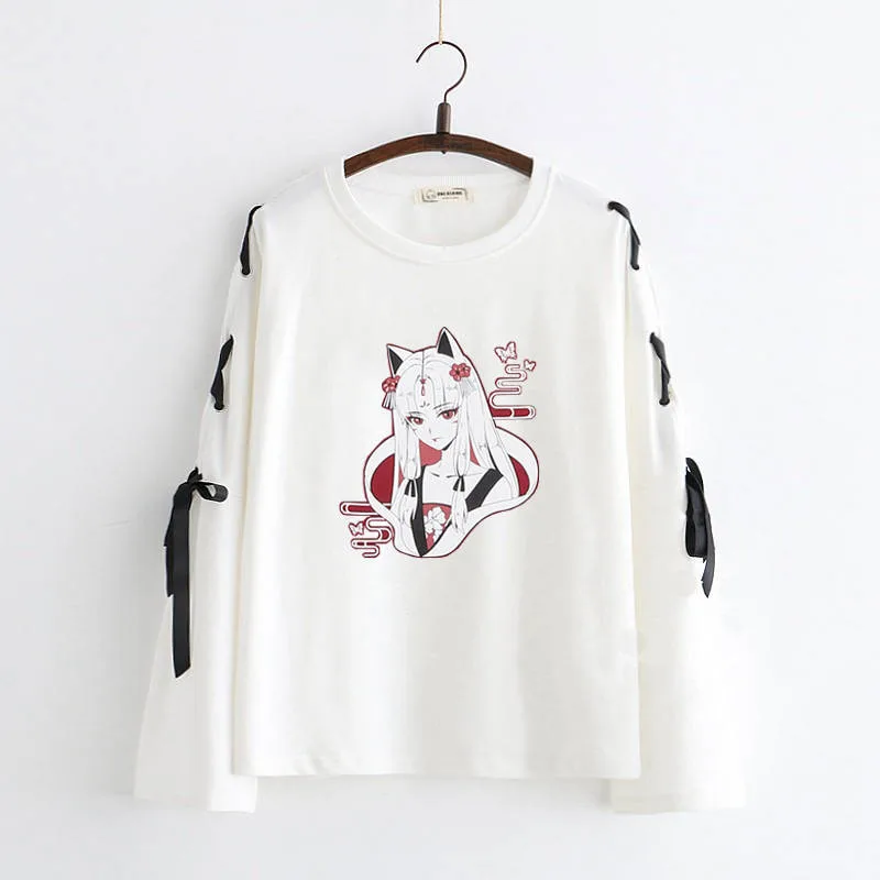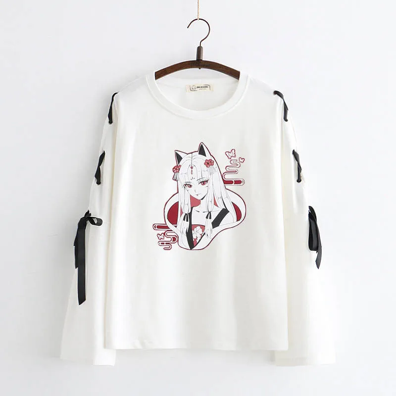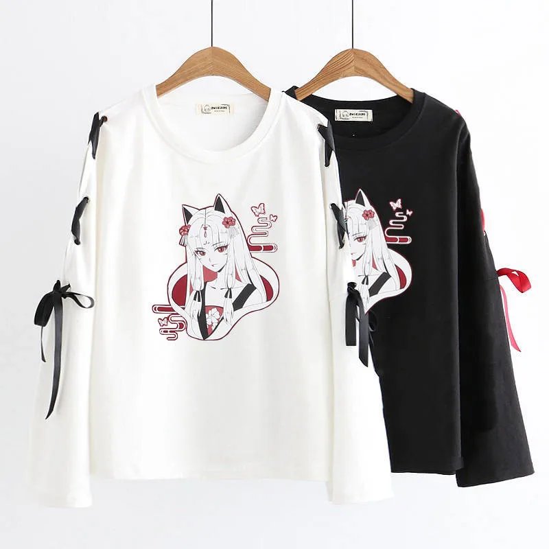 Футболка женская с длинным рукавом, повседневная Милая рубашка в японском стиле аниме, в Стиле Лолита, Неко атсум, с мультяшным принтом