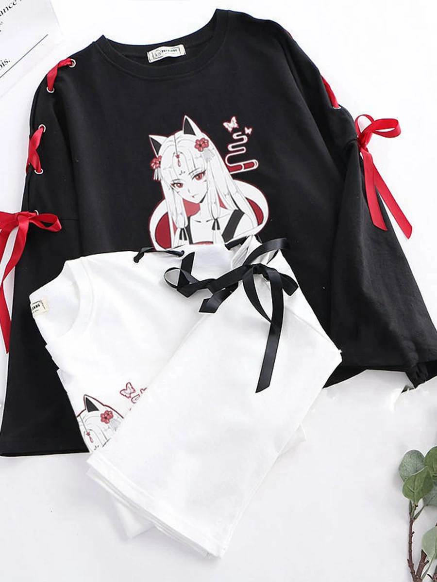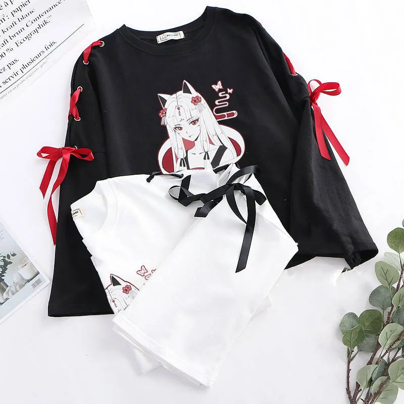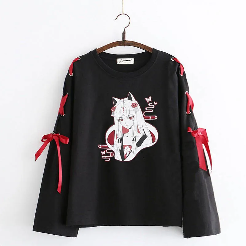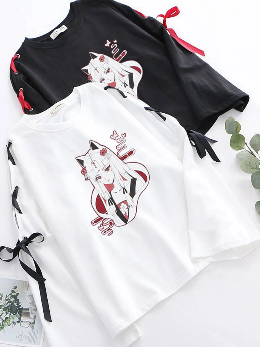 Футболка женская с длинным рукавом, повседневная Милая рубашка в японском стиле аниме, в Стиле Лолита, Неко атсум, с мультяшным принтом