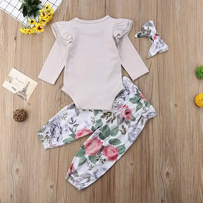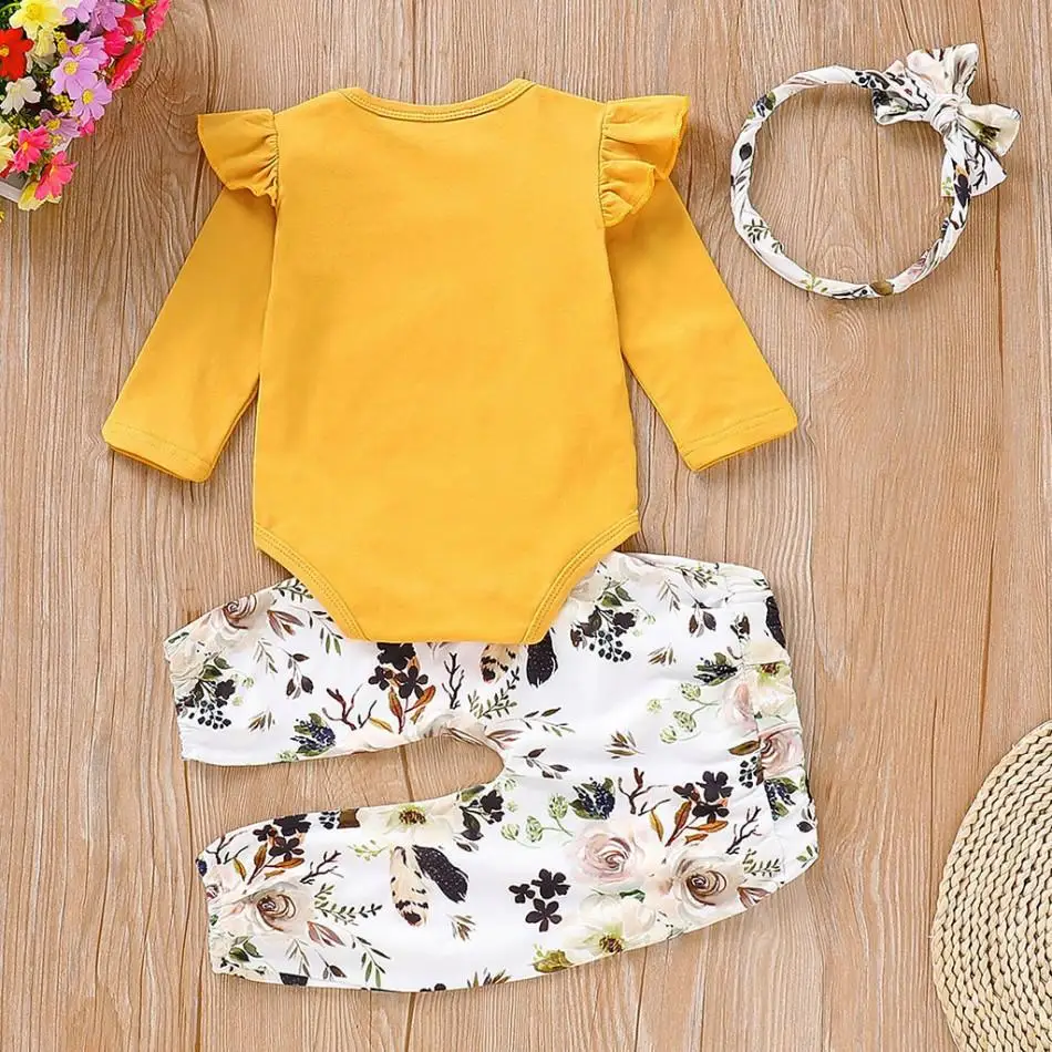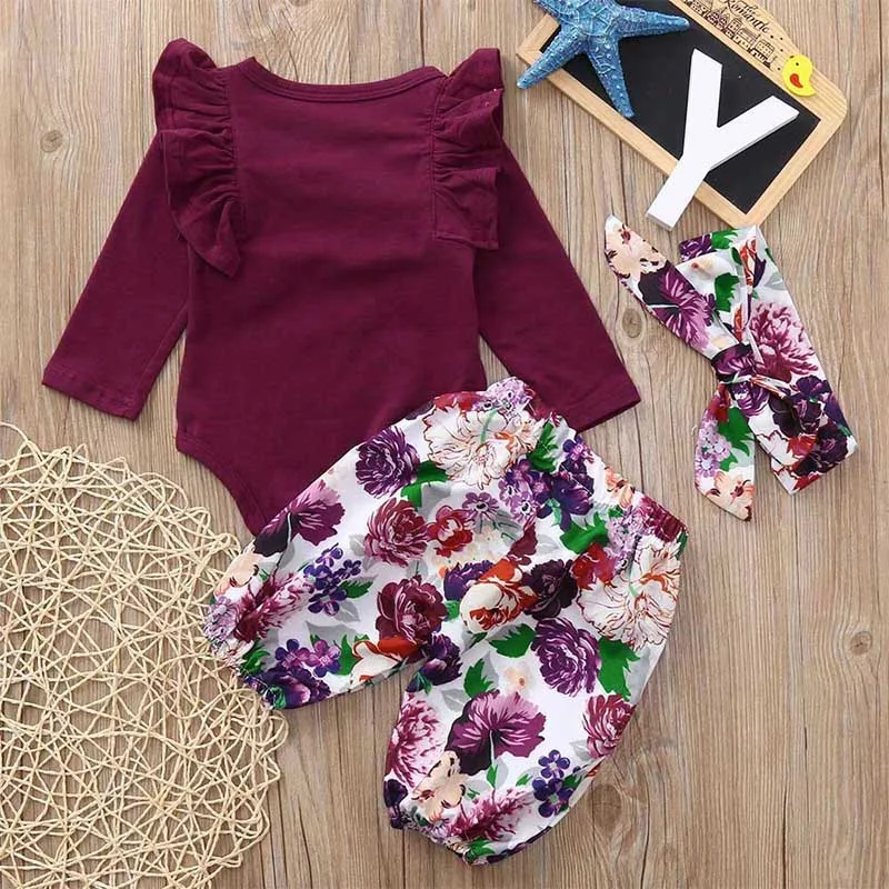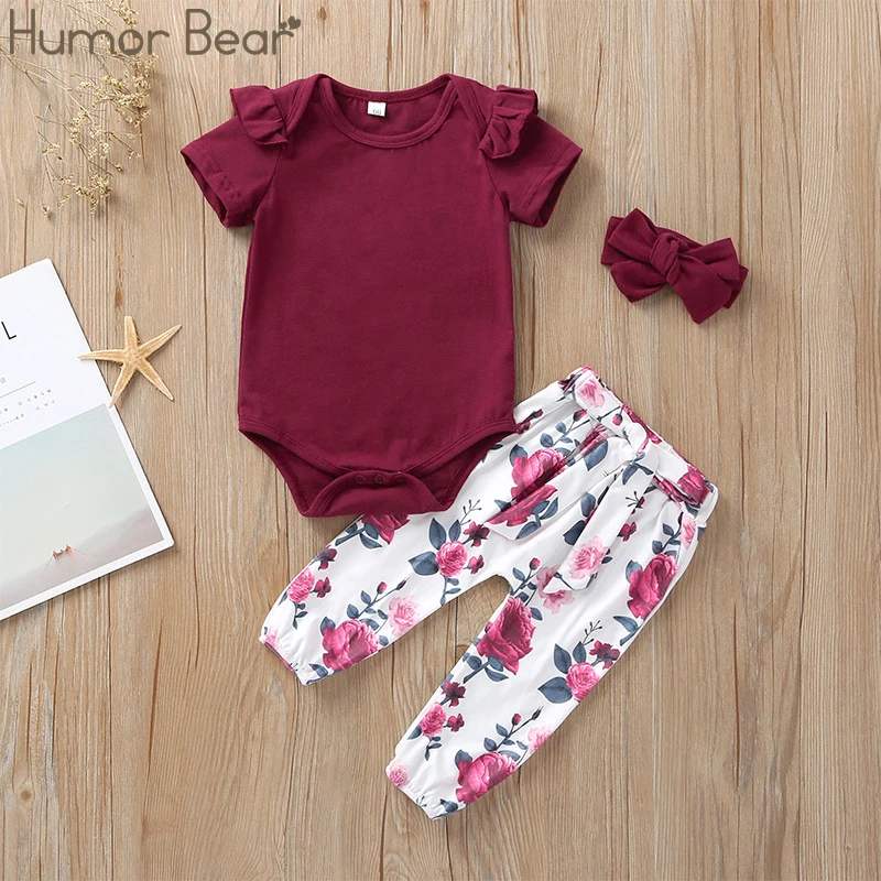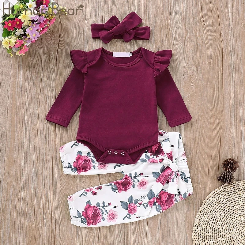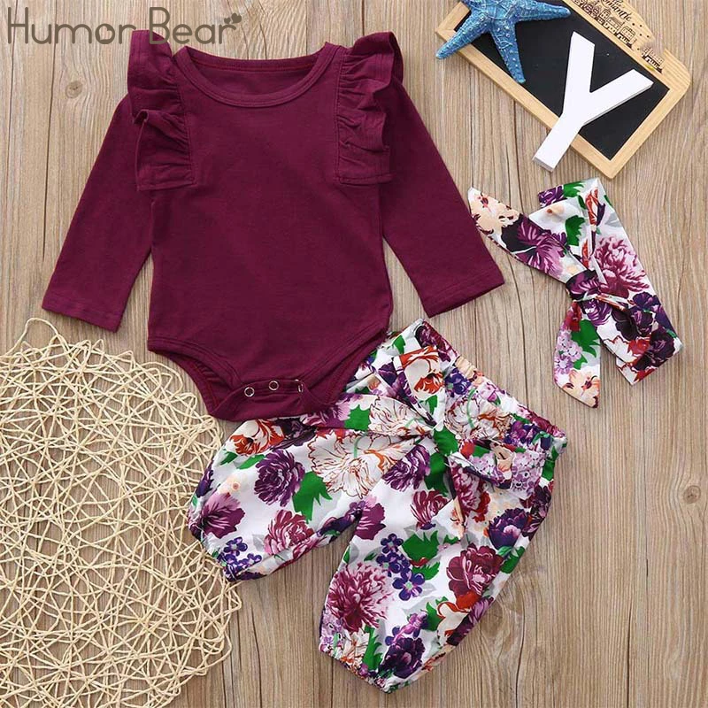 Комплект осенней одежды Humor Bear для маленьких девочек, 2022, хлопковая футболка с длинным рукавом + штаны с цветами + повязка на голову, 3 шт., комбинезоны, костюм для малышей