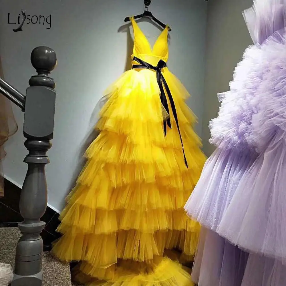 Женское вечернее платье с желтыми оборками, многослойное платье из фатина, вечерние платья размера плюс со шнуровкой на спине, 2019