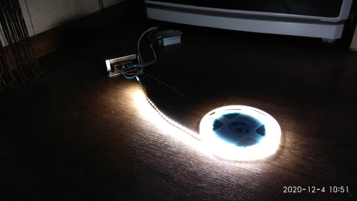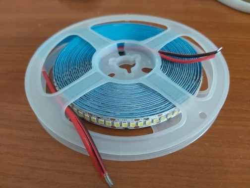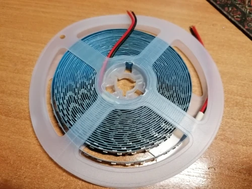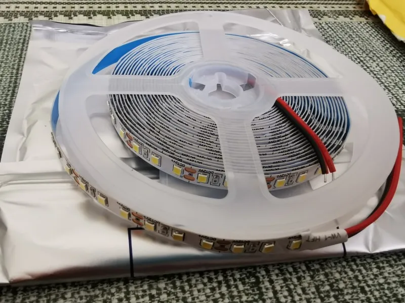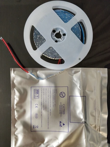 Только что прибыл, очень хорошее качество. Потребление энергии 2.9A при 24В. Там, где напряжение в начале полосы составляет 23,7 В, в конце остается только 20,3 в, поэтому питание обоих концов полосы было бы хорошей идеей. Достаточно света, чтобы осветить мой полный стол