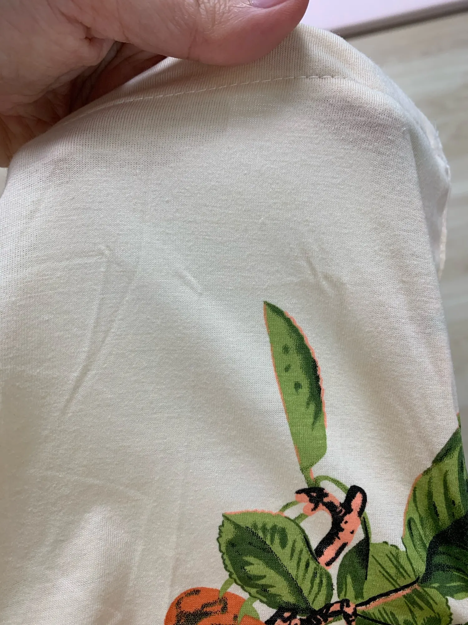 Очень быстрая доставка, но цвет совершенно другой, фото на белом фоне , цвет с оттенком кофе с молоком, цветы на рисунке грязно -оранжевого цвета, на фото фон костюма белый. Качество ткани приятное , качество пошива вызывает вопросы.