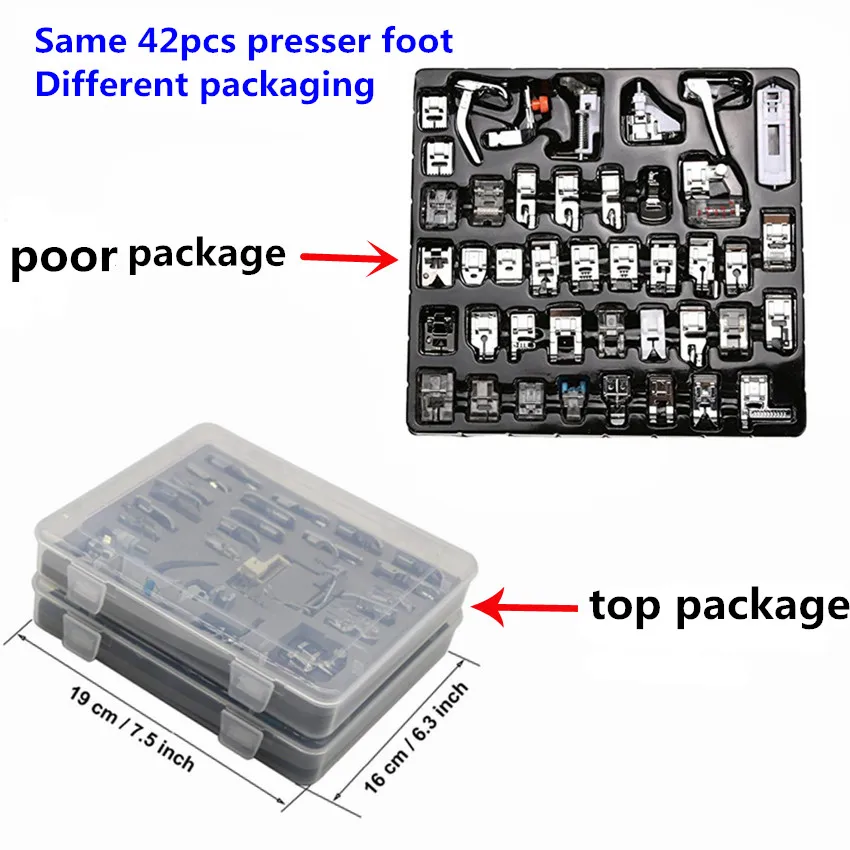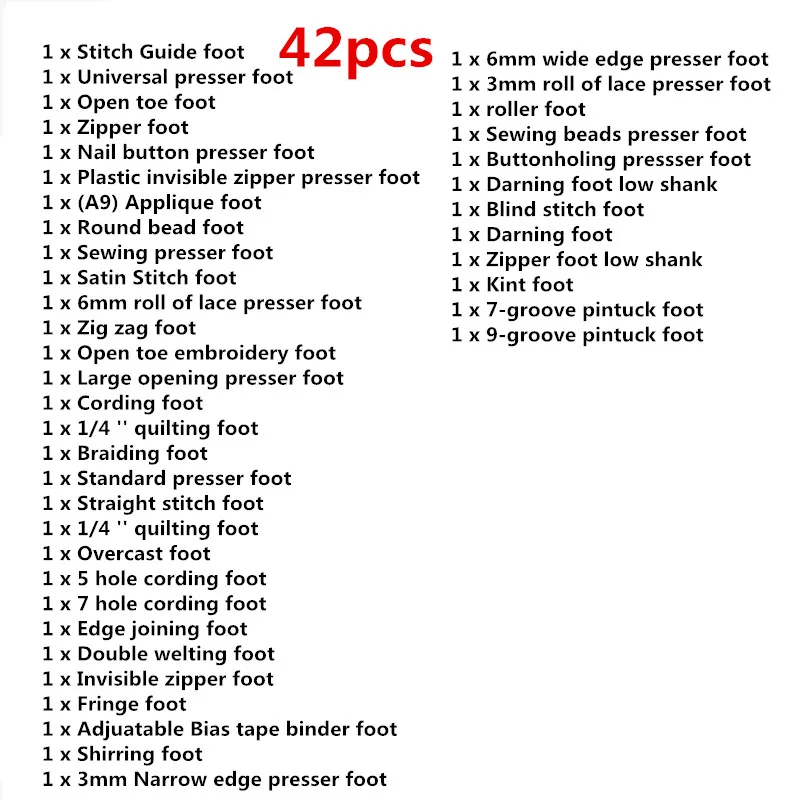 Особенности: 100% новый и высококачественный Очень Популярные и различные прижимные лапки для большинства бытовых многофункциональных швейных машин с низким хвостовиком, таких как Singer, Baby Lock, Brother, Janome и т. д. Количество: 1 комплект (32 шт.) Размер Чехла: 235x200x27 мм Цвет: как показано на рисунке Вес: 338 г Посылка входит 32 фута, список указан ниже: О: 1. Плетеная лапка; 2. Лапка с бахромой; 3. Ножка с 5 отверстиями; 4. 7 отверстий для шнура; 5. Соединительная лапка по краю; 6,1/4 "лапка для квилтинга; 7. Лапка прямого шва B: 1. Лапка для вышивки с открытым носком; 2. Лапка с круглым бисером; 3. Лапка для шва "Зиг-заг"; 4. Лапка для кординга; 5. 1/4 "лапка для квилтинга; 6. Канавки 9; 7. Пасмурная Лапка C: 1. Стежок направляющая нога; 2. Pintuck лапка 5 пазов; 3. Атласная лапка стежка; 4. Лапка для шва "Зиг-заг", Ягуар; 5. Двойная лапка сварки; 6. Невидимая лапка на молнии; 7. Роликовая Лапка D: 1. Лапка для слепых стежков; 2. Лапка для аппликации; 3. Лапка с открытым носком; 4. Лапка для штопки, низкий хвостовик; 5. Лапка для сборки/сварки; 6. Лапка для подшивки; 7. Круглая лапка для подшивки E: 1. Лапка Darnign, низкий хвостовик; 2. Регулируемая лапка для вязания; 3. Лапка для вязания; 4. Лапка на молнии, низкий хвостовик Примечание: Товар не подходит для бытовых старых швейных машин, швейных мини-машин, промышленных швейных машин, швейных машин с высокой ручкой и швейных машин с наклонной ручкой.