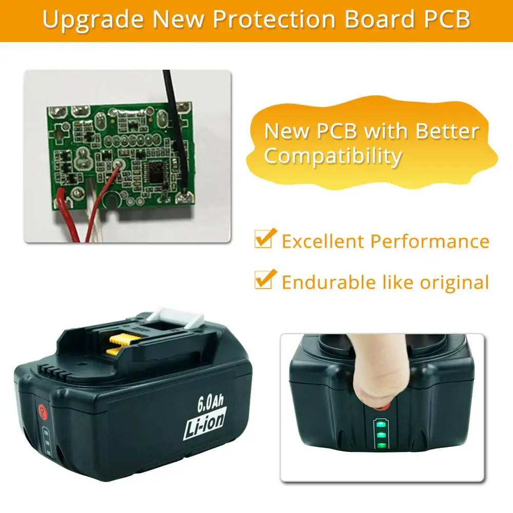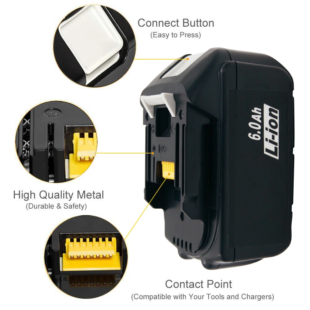Характеристики:Состояние: 100% Новый Сменный аккумуляторТовар: Аккумулятор для MakitaТип ячеек: литийНапряжение: 18 вЕмкость: 6000 мАчЗнать, сколько заряда вы оставили в батарее с светодиодный idicator, активированный с помощью кнопки.Защита от перегрузки, перегрузки и короткого замыкания.Без эффекта памяти, может быть заряжен или разряжен по мере необходимости без потери емкости.Сертификат безопасности: CE UL FCC RoHS PSE Заменить на оригинальные батареи:194204-5 194205-3 194309-1 194230-4 BL1815 BL1830 BL1840 LXT400 BL1860 BL1860B BL1850B BL1840B Совместимые модели: Введите (CTRL + F), чтобы найти вашу модель.BDF453SHE,BDF454Z,BHP452,BML184, BML185, BST221Z,BTDW251Z,ML185,TD140D, TW251D,BCS550Z,BDA350 BDA350Z, BDF451, BDF451Z,BFR550L, BFR550Z,BFR750, BFR750L, BFR750Z,BFS450RFE, BFS450Z,BGA452, bga2zBHP451SFE, BHP451Z,BHP453, BHP453SHE,BHP454, BHP454Z, BHR202RFE, BHR202Z, BHR240, BHR240Z, BHR241, BHR241Z,BJR181X1,BJR181Z,BJR182X, BJR182Z,BJS130Z,BJV180Z,BPB180Z,BSS501Z,BSS610SFE, BSS610X2,BSS610Z BSS611X, BSS611Z,BTD140SFE, BTD140Z, BTD141, BTD141Z, BTW450, BTW450Z,BUB182, BUB182Z,BVR350, BVR350Z BVR450, BVR450Z,BVR850, BVR850Z,DF454D,DF454DRFX, DF454DZ, HP454D, HP454DRFX, HP454DZ,HR202D, HR202DRFX HR202DZK,JR120D,JR120DRF, JR120DZK,ML184 (фонарик),MR100, MR100W,PB108D, PB108DRFX, PB108DZ,TD144DRFX TD144DZ,TD251DRFX, TD251DZ. Теплые Примечания:1. Пожалуйста, полностью зарядите аккумулятор перед первым использованием.2. Если вы не собираетесь использовать аккумулятор в течение месяца или дольше, храните его в чистом, сухом, прохладном месте вдали от огня и воды.3. Пожалуйста, Перезарядите его после длительного хранения. Поскольку Ni-Cd/Ni-mh и литий-ионные аккумуляторы будут саморазряжаться во время хранения.4. Не Разделяйте, не выдавливайте и Не ударяйте. Посылка:2*18V 6.0Ah литиевая Замена аккумуляторные инструменты батарея для Makita2 * Руководство пользователя