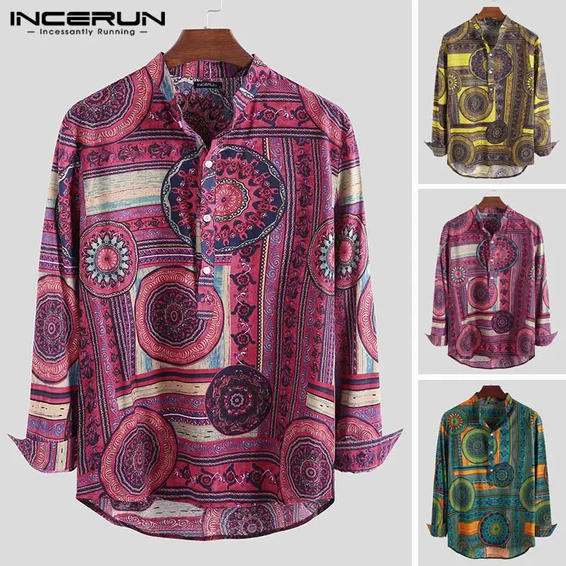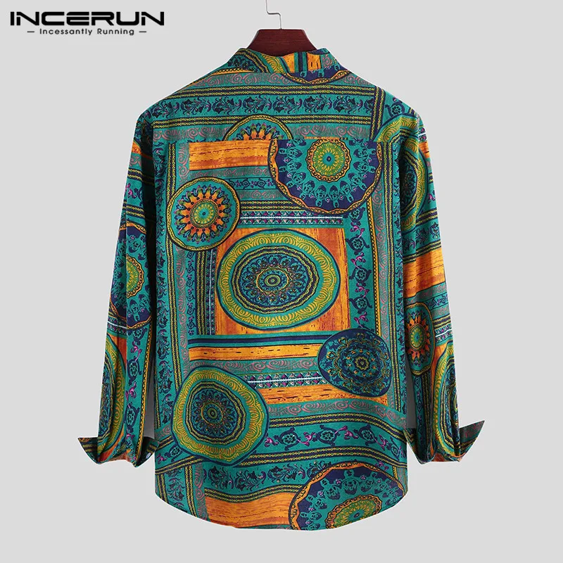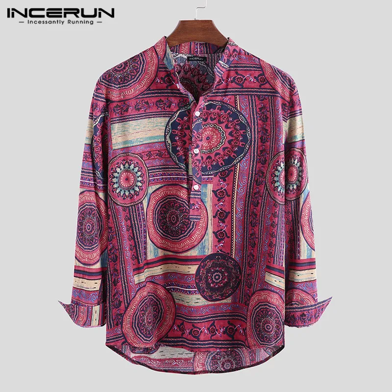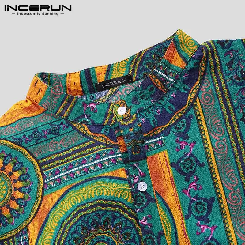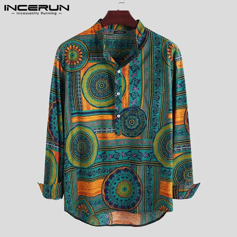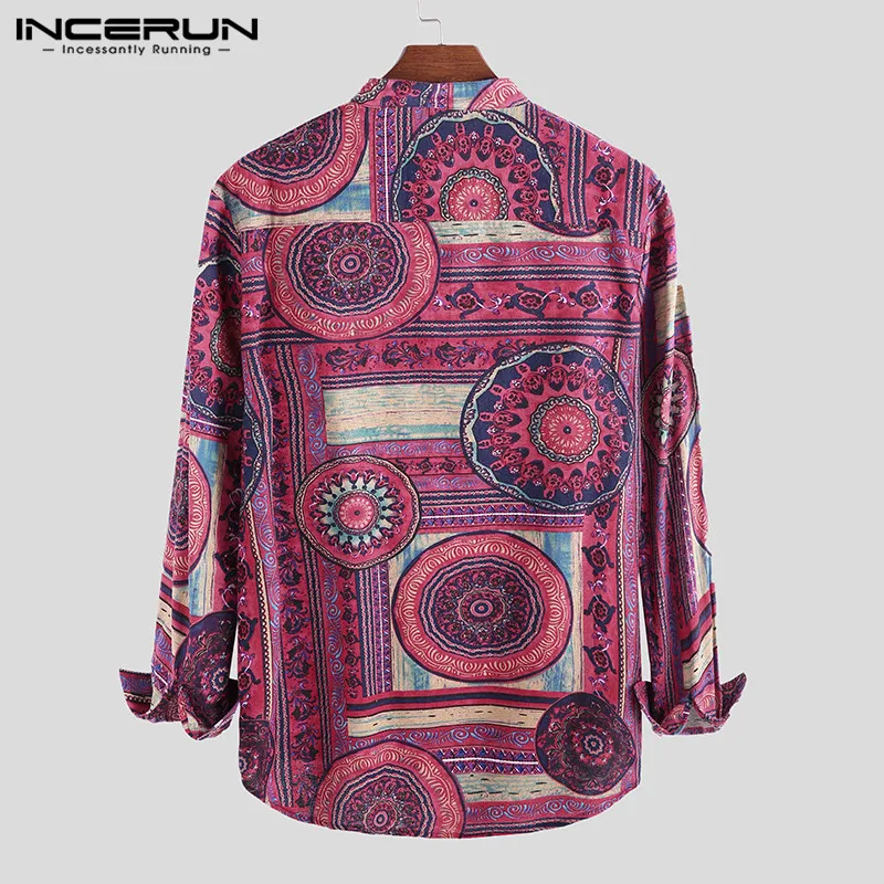 INCERUN, 2020, хлопковая рубашка в этническом стиле, Мужская винтажная рубашка с воротником-стойкой и принтом, повседневные рубашки с длинными рукавами, Camisa, S-5XL, уличная одежда