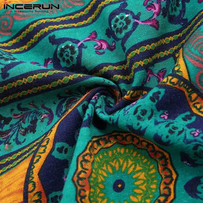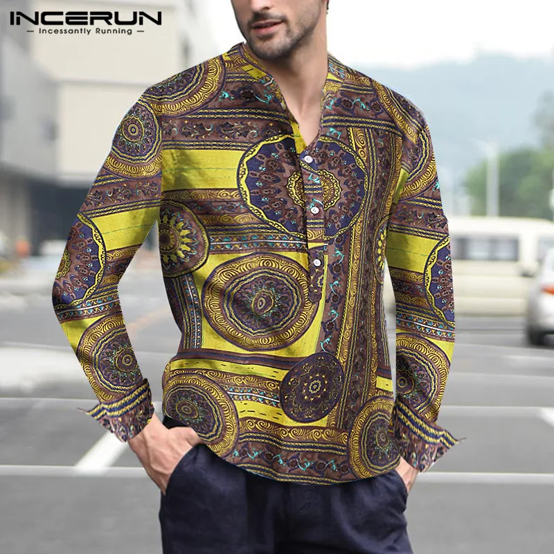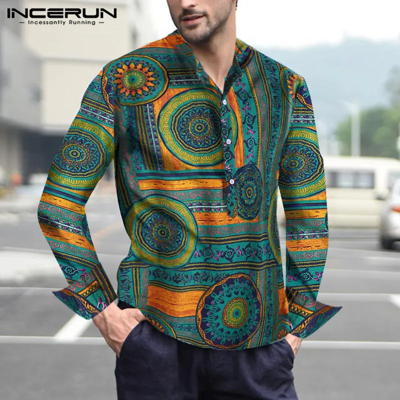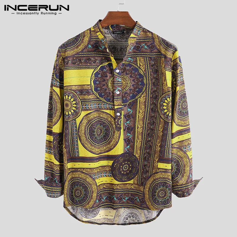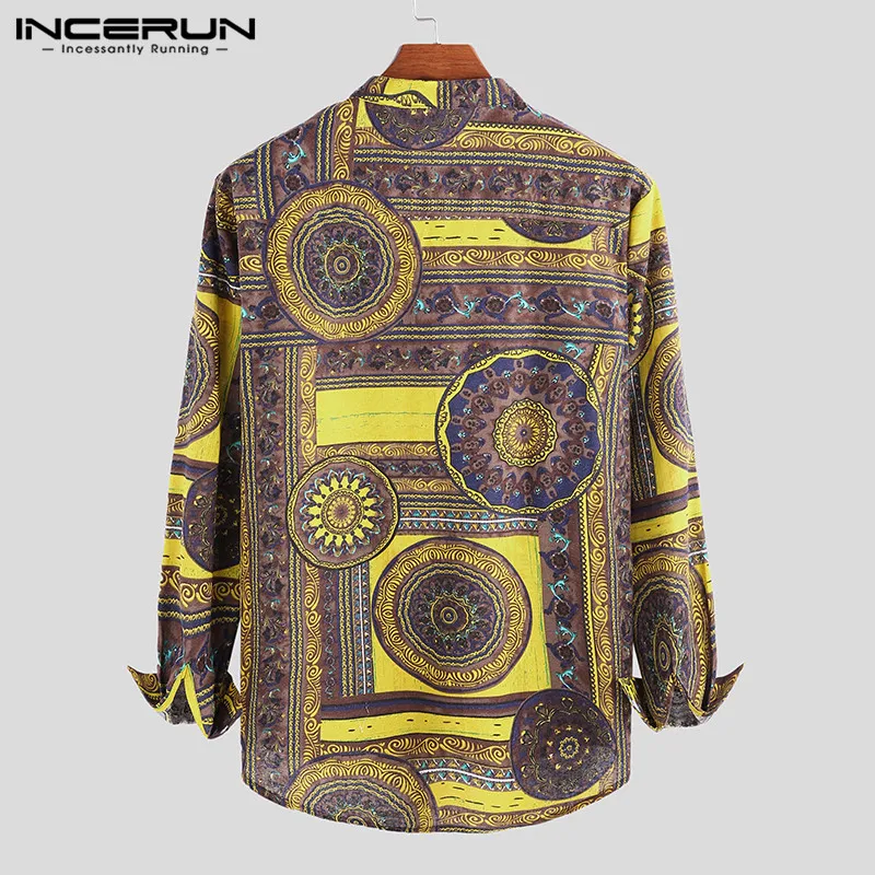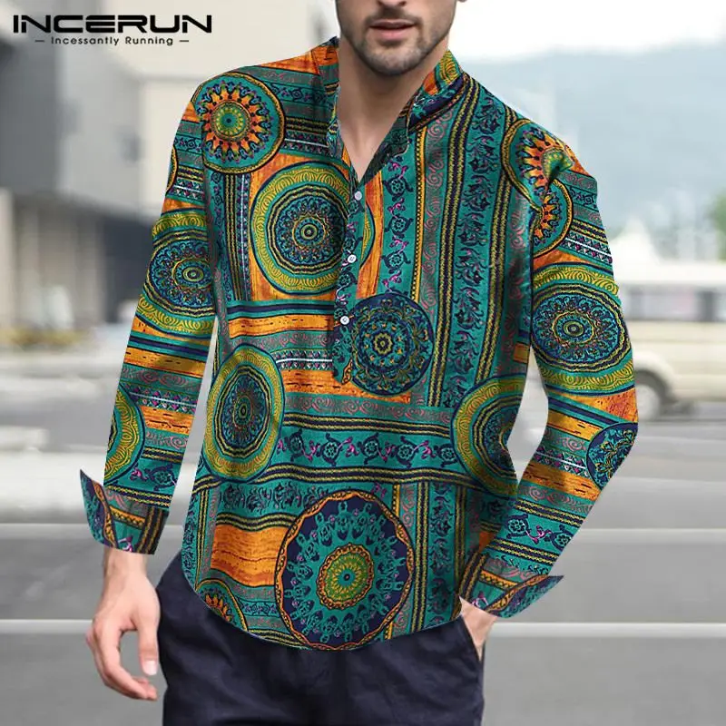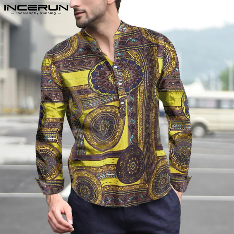 INCERUN, 2020, хлопковая рубашка в этническом стиле, Мужская винтажная рубашка с воротником-стойкой и принтом, повседневные рубашки с длинными рукавами, Camisa, S-5XL, уличная одежда