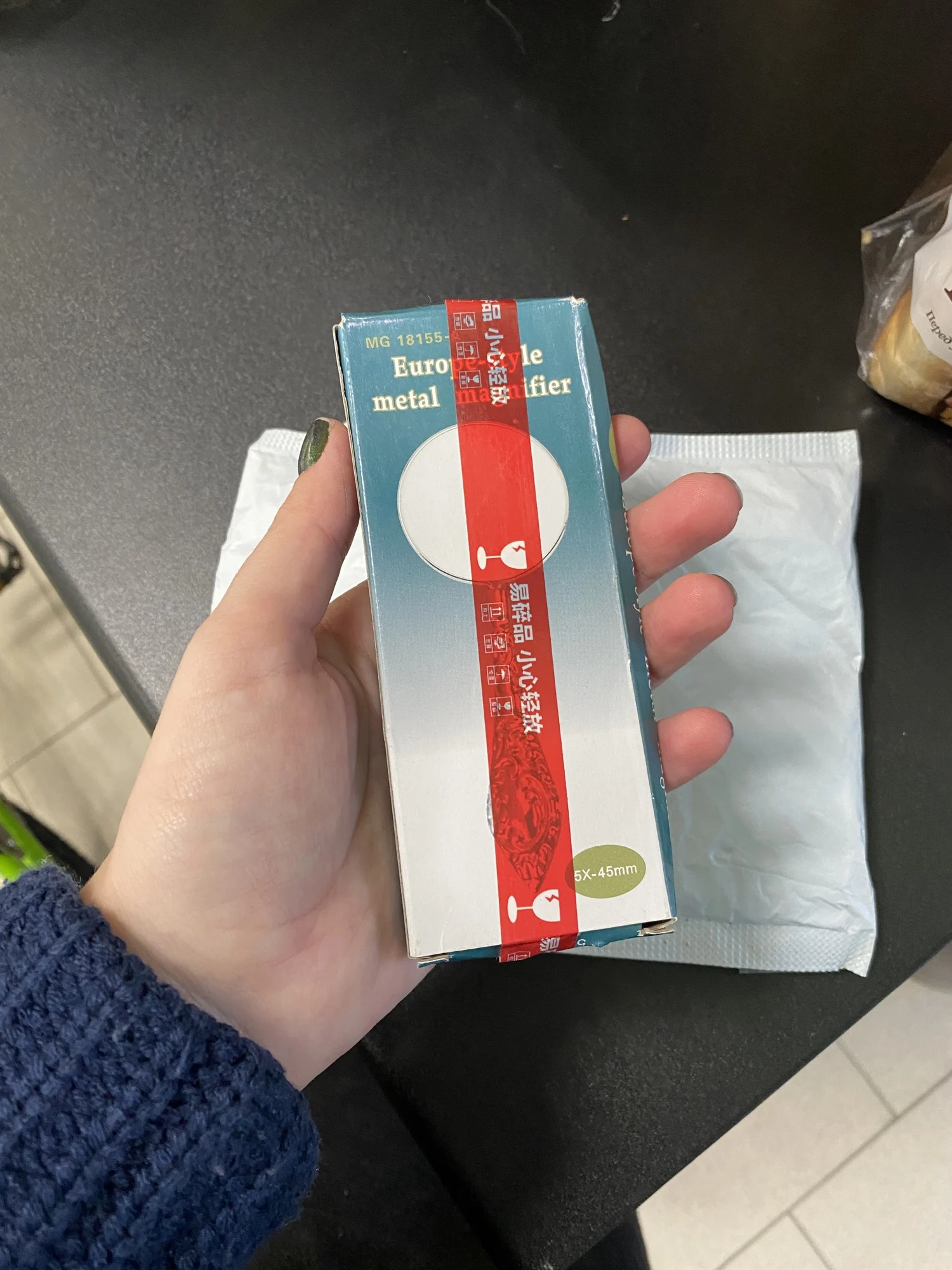 Лупа пришла за 2 недели. После таможни не отслеживалась, но сообщение о прибытии пришло. Упакована в картонную коробку, которая вся измялась и пакет с пупыркой внутри. Сама лупа небольшая и симпатичная. Стекло без царапин, увеличивает. Спасибо!