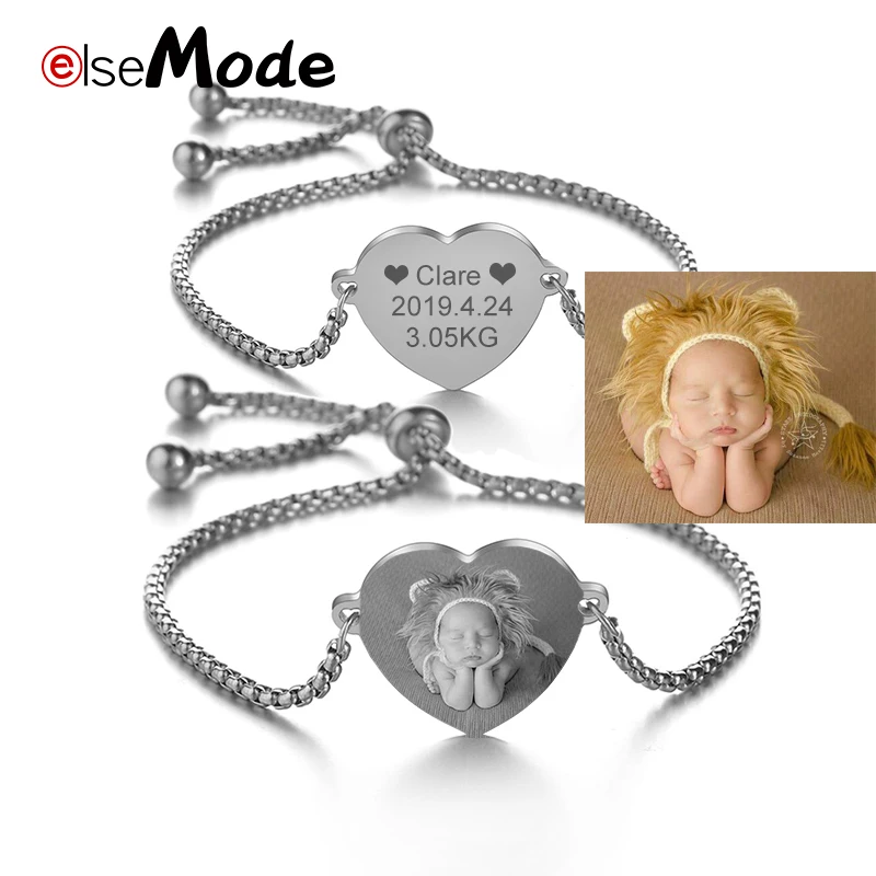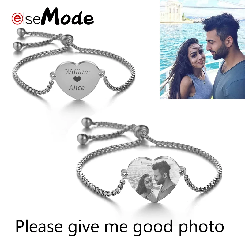 Регулируемые браслеты ELSEMODE из нержавеющей стали с индивидуальной гравировкой фото имени для женщин, подарок на день Святого Валентина