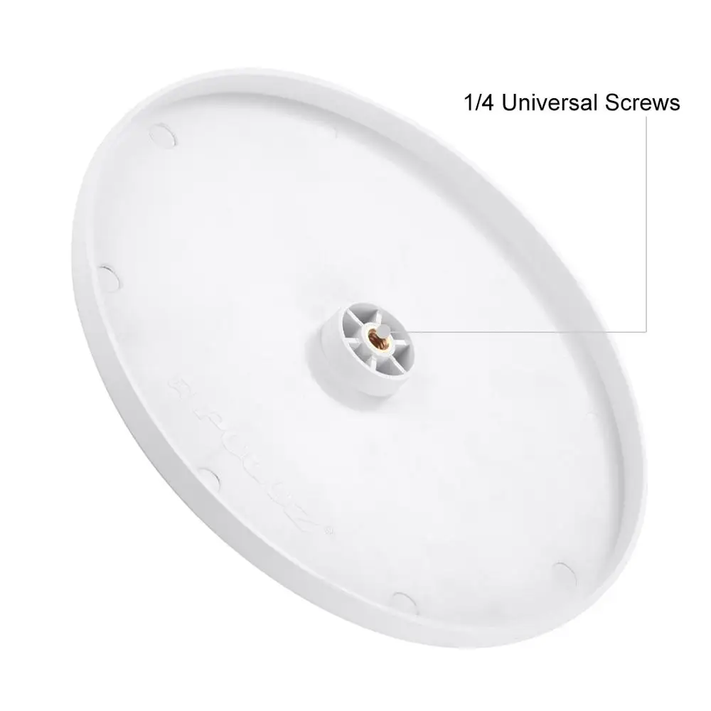 1. Изготовлен из высококачественного АБС-материала, прочный в использовании. 2. Подходит для панорамного штатива с поворотом на 360 градусов, вращение на 360 градусов для отображения того, что вы хотите показать, отображения ювелирных изделий, часов, цифрового продукта, стеклянной чашки, некоторых мелких вещей, это хороший инструмент для фотографирования в палатке 3. Белый цвет, экономит время на вырезанные фотографии фона. 4. Крепежная резьба 1/4 дюйма в нижней части поддерживает любые резьбовые аксессуары 1/4 дюйма, такие как крепления штатива.