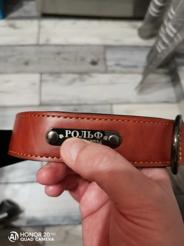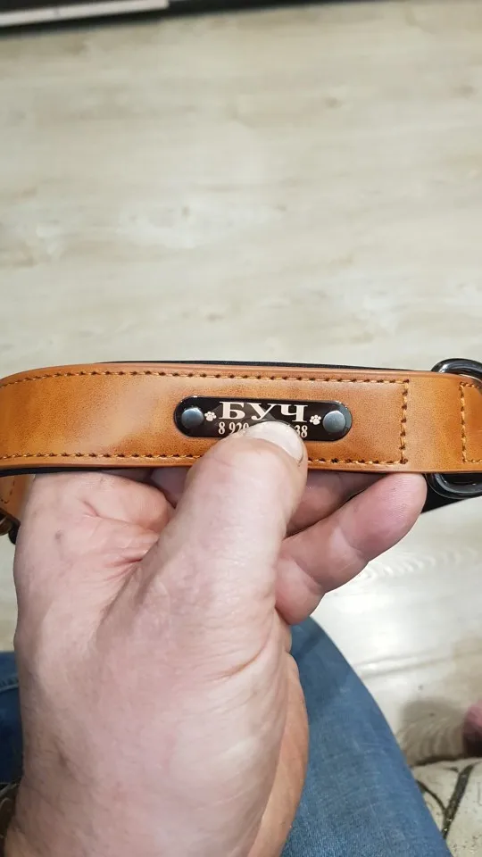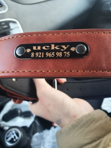 Шикарный ошейник, мягкая внутренняя часть,красиво смотрится. Пришёл без гравировки, почему-то при заказе не сохранился комментарий для продавца, но продавец мне написал, а я не видела сообщение, так что это моя вина, к продавцу претензий нет. Заказала второй уточнила через сообщения про гравировку и взяла на размер меньше, этот был немного большеват, хотя мерила по нашему ошейнику (50 вся длинна ошейника). Но нам есть кому носить ошейник. Спасибо продавцу. В Калининградскую область меньше чем за месяц дошёл!!!