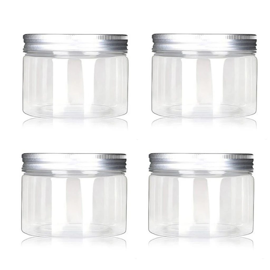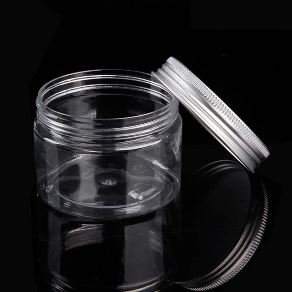 Прозрачная пластиковая баночка с алюминиевыми крышками, пустые косм...