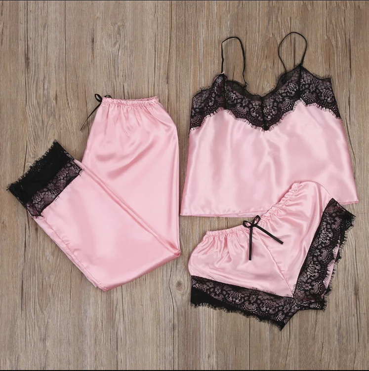 Женская атласная кружевная ночная рубашка, нижнее белье Babydoll, ночная рубашка, шорты, женская сексуальная одежда для сна, набор нарядов 3 шт.компл.