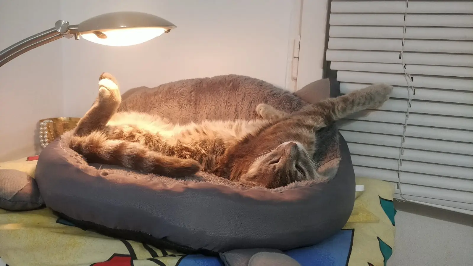 Он выглядит как на картинке. Кошка хорошо спит.