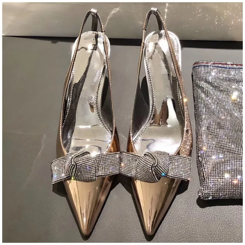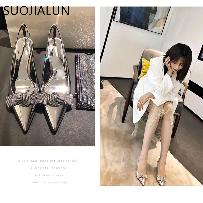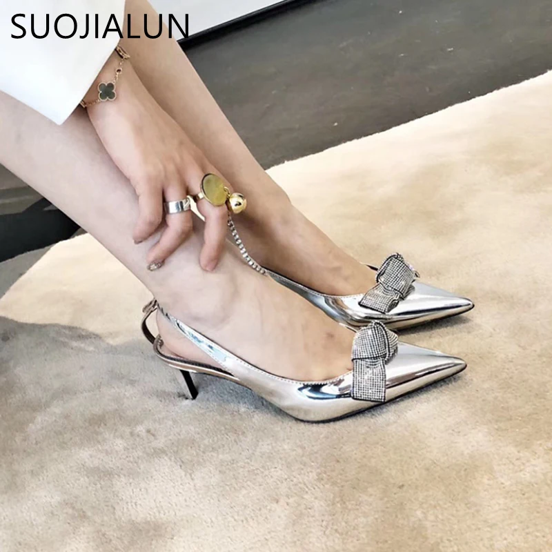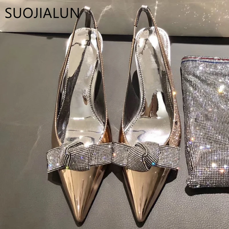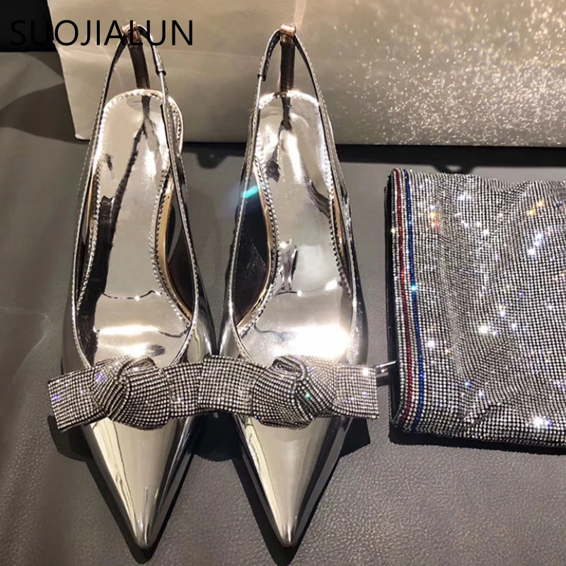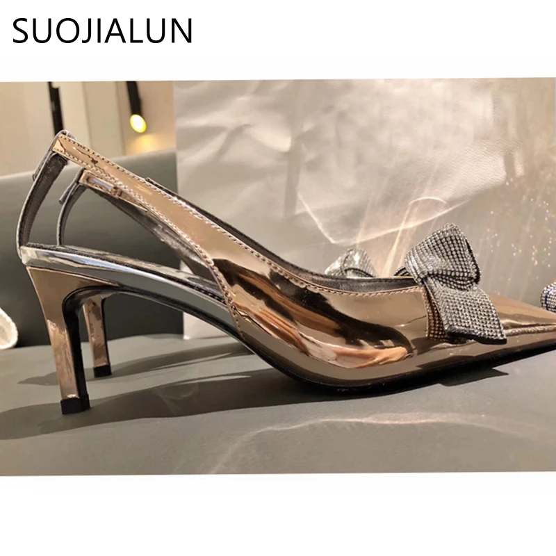 Женские босоножки SUOJIALUN, элегантные свадебные туфли-лодочки на высоком каблуке, украшенные Стразы, вечерние бантом-бабочкой, новинка 2021