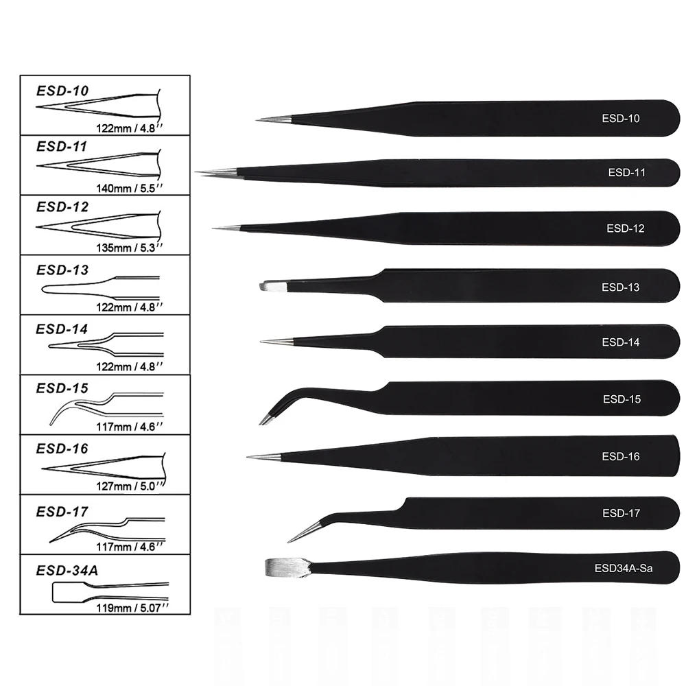 Характеристики: 100% новое высокое качество. Антистатические и антимагнитные. Точный Пинцет Установите тонкий наконечник. Подходит для высокоточной инженерной промышленности. ESD-10 (стандарт): используется для припоя интегральных микросхем и для установки или замены деталей. ESD-11 (большой): это сопло длиннее стандартного типа и подходит для работы в точных электронных компонентах. ESD-12 (высокая Растяжка): Эта насадка более мощна, чем стандартные пинцеты, и она не сгибается, когда плата зажимается с сильной силой, и детали не упадут. ESD-13 (круг): этот круг позволяет избежать повреждения компонентов и подходит для извлечения пластинчатых сколов; ESD-14 (дополнительно): эта насадка очень тонкая и острая, подходит для работы в компонентах микросхем высокой плотности. ESD-15 (Eagle Tsui): это сопло согнуто при 450 ° и подходит для извлечения деталей в узких местах. Фирменный Пинцет GOOT изготовлен из антимагнитной, стойкой к кислоте и коррозии нержавеющей стали. Хорошая прочность, Немагнитный материал, гибкий, длительное использование пальцев не будет усталостью, подходит для тонкой работы в прецизионной электронной промышленности, удобный, безопасный, гибкий, гибкий и прочный в работе магнитных ржавчины компонентов. ESD-16 (заостренный): используется для сварки интегральных схем для замены прецизионных деталей ESD-17 (Изогнутый наконечник): общая длина головки подходит для тонкой работы в узких пространствах ESD34A-Sa (головка quare): используется для сварки интегральных схем для замены прецизионных деталей