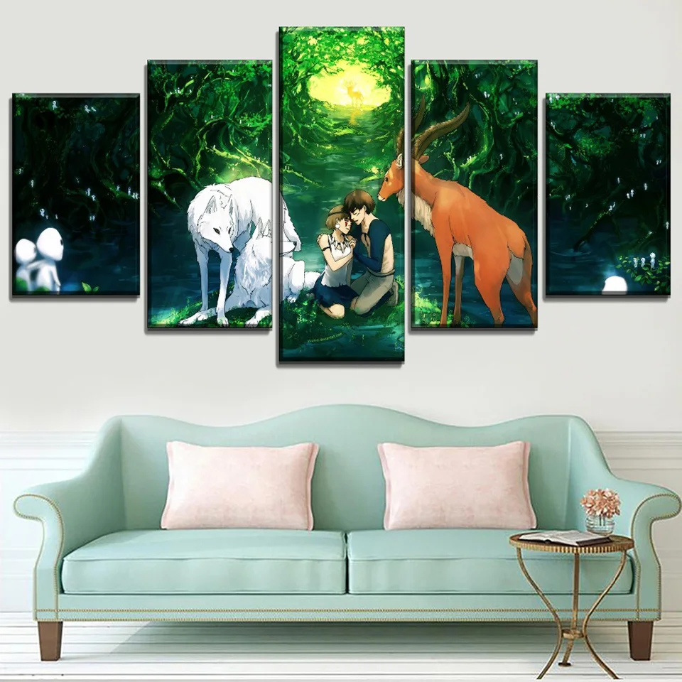 Постер с принтом, домашний декор, холст, 5 шт., картина принцессы Мононоке, аниме, настенное искусство, современная картина для спальни, Модульная картина