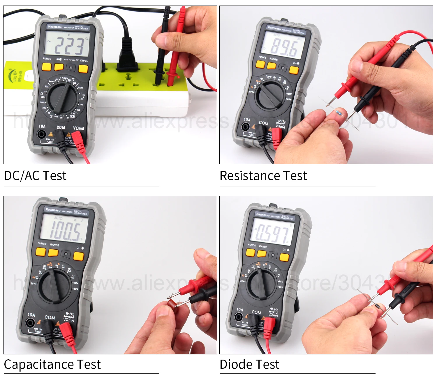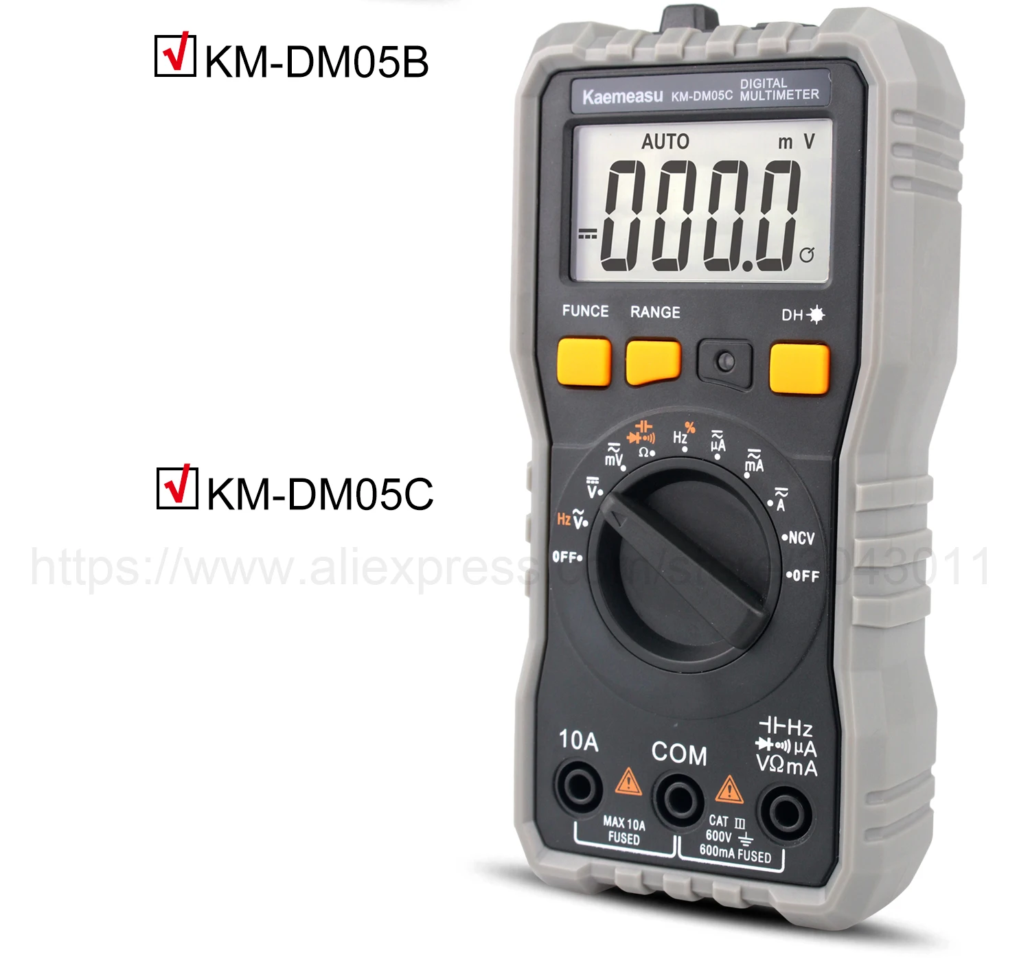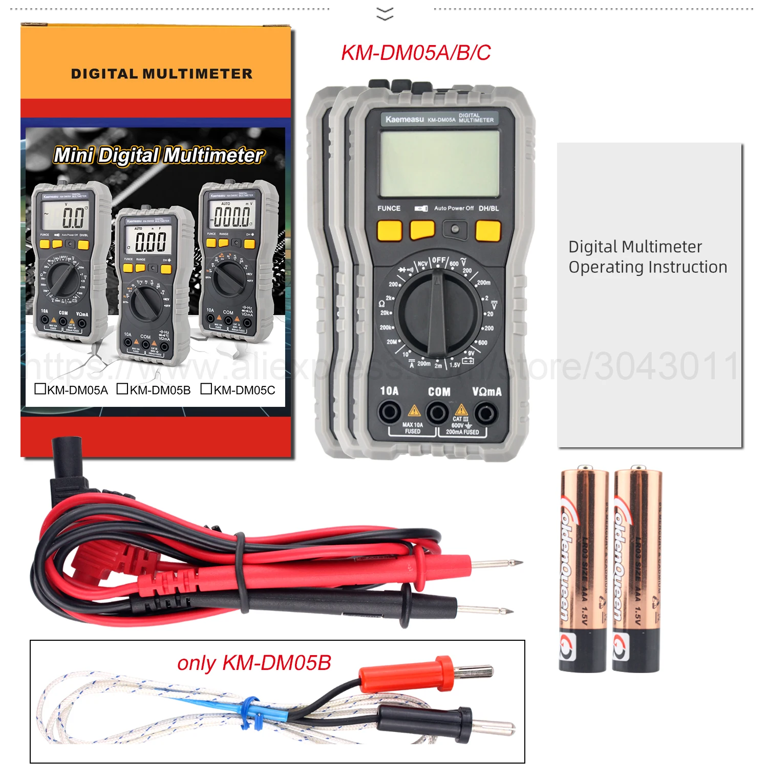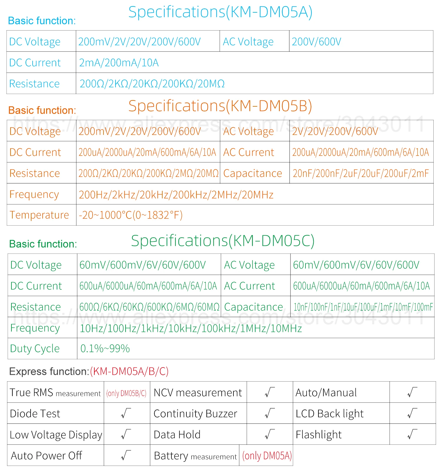 [Только KM-DM05A] Обзор:Напряжение постоянного тока: 200 мВ/2 в/20 в/200 В/600 вНапряжение переменного тока: 200 В/600 ВТок постоянного тока: 2ма/200мА/10АСопротивление: 200Ω/2K Ω/20K Ω/200K Ω/20MΩ[Только KM-DM05B] Обзор:Напряжение постоянного тока: 200 мВ/2 в/20 в/200 В/600 вНапряжение переменного тока: 2 в/20 в/200 В/600 вТок постоянного тока: 200uA/2000uA/20mA/600mA/6A/10AТок переменного тока: 200uA/2000uA/20mA/600mA/6A/10AСопротивление: 200Ω/2K Ω/20K Ω/200K Ω/2M Ω/20MΩЕмкость: 20nF/200nF/2 мкФ/20 мкФ/200 мкФ/2mFЧастота: 200 Гц/2 кГц/20 кГц/200 кГц/2 МГц/20 МГцТемпература: -20 ~ 1000 ℃(0 ~ 1832 ℃)[Только KM-DM05C] Обзор:Напряжение постоянного тока: 60 мВ/600 мВ/6 В/60 в/600 ВНапряжение переменного тока: 60 мВ/600 мВ/6 В/60 в/600 ВТок постоянного тока: 600uA/6000uA/60mA/600mA/6A/10AТок переменного тока: 600uA/6000uA/60mA/600mA/6A/10AСопротивление: 600Ω/6K Ω/60K Ω/600K Ω/6M Ω/60MΩЕмкость: 10nF/100nF/1nF/10 мкФ/100 мкФ/1mF/10mF/100mFЧастота: 10 Гц/100 Гц/1 кГц/10 кГц/100 кГц/1 МГц/10 МГцРабочий цикл: 0.1%-99%Экспресс-Функция:Измерение батареи: Да [только KM-DM05A]Истинное измерение RMS: Да [только KM-DM05B KM-DM05C]Измерение NCV: ДаАвто/Руководство: ДаДиодный Тест: ДаНепрерывный зуммер: ДаЖК-задний светильник: ДаДисплей низкого напряжения: ДаХранение данных: ДаФонарик: ДаАвтоматическое выключение питания: ДаОбщие характеристики:Дисплей: жидкокристаллический дисплей (ЖК-дисплей)Рабочая среда: (0 ~ 40)℃, относительная влажность <80%Мощность питания: 2*1,5 в ААА батареи [только в том случае, KM-DM05B KM-DM05C] (не входит в комплект)Мощность питания: 3*1,5 в ААА батареи [только в том случае, KM-DM05A] (не входит в комплект)Объем (размер): 152 × 73 × 48 ммВес: 202 гУпаковка включает:1 * Цифровой мультиметр1 * Тестовые провода1 * Датчик температуры [только KM-DM05B]1 * руководство на английском языке1 * цветная коробкаОбратите внимание: товар отправляется без аккумулятора