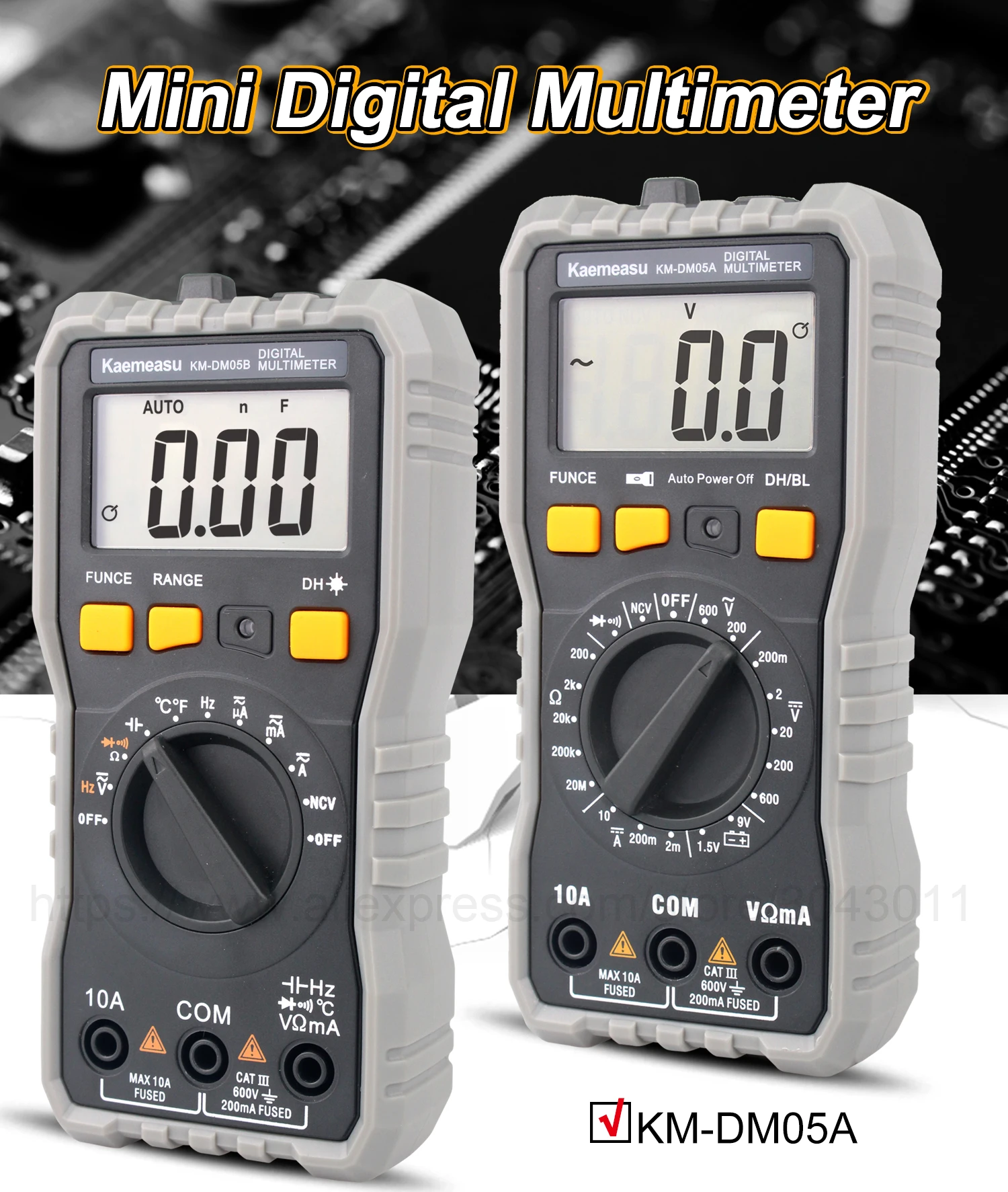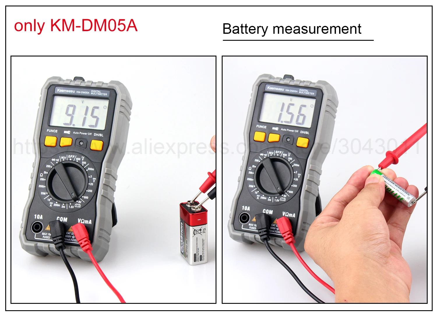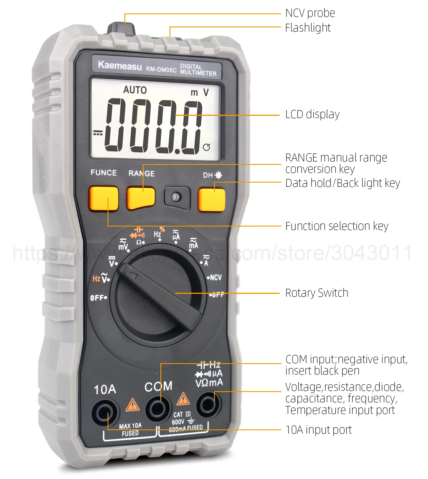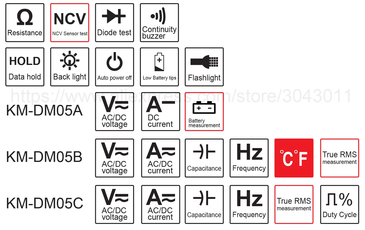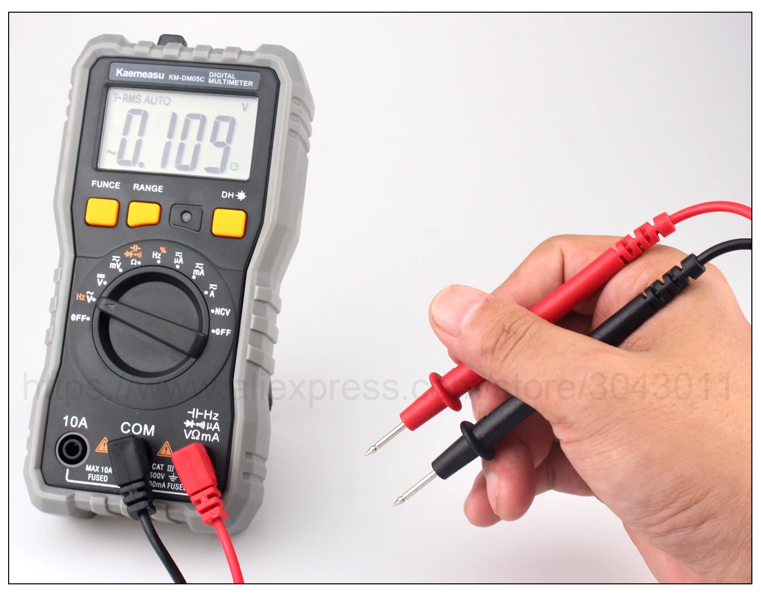 [Только KM-DM05A] Обзор:Напряжение постоянного тока: 200 мВ/2 в/20 в/200 В/600 вНапряжение переменного тока: 200 В/600 ВТок постоянного тока: 2ма/200мА/10АСопротивление: 200Ω/2K Ω/20K Ω/200K Ω/20MΩ[Только KM-DM05B] Обзор:Напряжение постоянного тока: 200 мВ/2 в/20 в/200 В/600 вНапряжение переменного тока: 2 в/20 в/200 В/600 вТок постоянного тока: 200uA/2000uA/20mA/600mA/6A/10AТок переменного тока: 200uA/2000uA/20mA/600mA/6A/10AСопротивление: 200Ω/2K Ω/20K Ω/200K Ω/2M Ω/20MΩЕмкость: 20nF/200nF/2 мкФ/20 мкФ/200 мкФ/2mFЧастота: 200 Гц/2 кГц/20 кГц/200 кГц/2 МГц/20 МГцТемпература: -20 ~ 1000 ℃(0 ~ 1832 ℃)[Только KM-DM05C] Обзор:Напряжение постоянного тока: 60 мВ/600 мВ/6 В/60 в/600 ВНапряжение переменного тока: 60 мВ/600 мВ/6 В/60 в/600 ВТок постоянного тока: 600uA/6000uA/60mA/600mA/6A/10AТок переменного тока: 600uA/6000uA/60mA/600mA/6A/10AСопротивление: 600Ω/6K Ω/60K Ω/600K Ω/6M Ω/60MΩЕмкость: 10nF/100nF/1nF/10 мкФ/100 мкФ/1mF/10mF/100mFЧастота: 10 Гц/100 Гц/1 кГц/10 кГц/100 кГц/1 МГц/10 МГцРабочий цикл: 0.1%-99%Экспресс-Функция:Измерение батареи: Да [только KM-DM05A]Истинное измерение RMS: Да [только KM-DM05B KM-DM05C]Измерение NCV: ДаАвто/Руководство: ДаДиодный Тест: ДаНепрерывный зуммер: ДаЖК-задний светильник: ДаДисплей низкого напряжения: ДаХранение данных: ДаФонарик: ДаАвтоматическое выключение питания: ДаОбщие характеристики:Дисплей: жидкокристаллический дисплей (ЖК-дисплей)Рабочая среда: (0 ~ 40)℃, относительная влажность <80%Мощность питания: 2*1,5 в ААА батареи [только в том случае, KM-DM05B KM-DM05C] (не входит в комплект)Мощность питания: 3*1,5 в ААА батареи [только в том случае, KM-DM05A] (не входит в комплект)Объем (размер): 152 × 73 × 48 ммВес: 202 гУпаковка включает:1 * Цифровой мультиметр1 * Тестовые провода1 * Датчик температуры [только KM-DM05B]1 * руководство на английском языке1 * цветная коробкаОбратите внимание: товар отправляется без аккумулятора