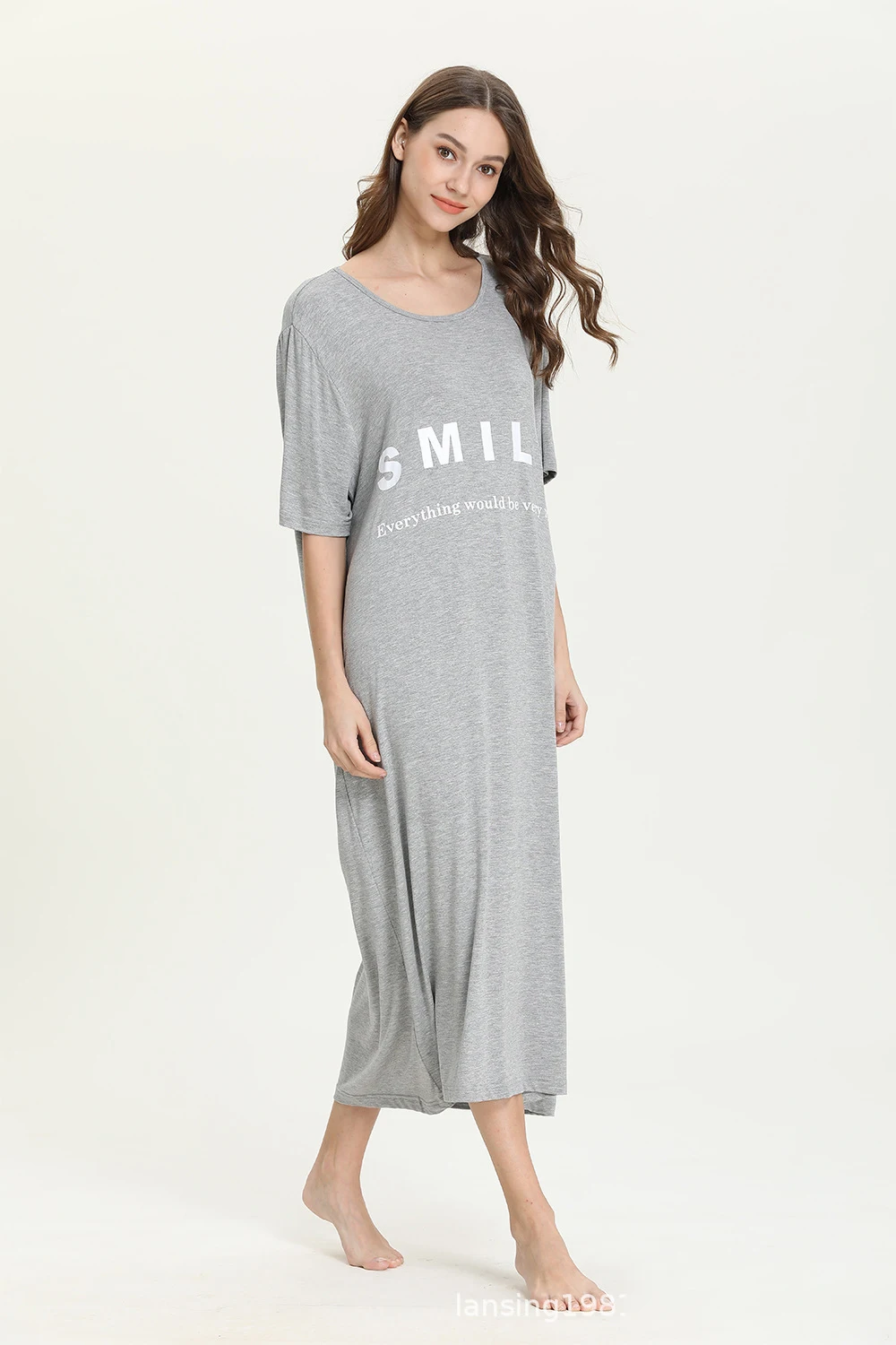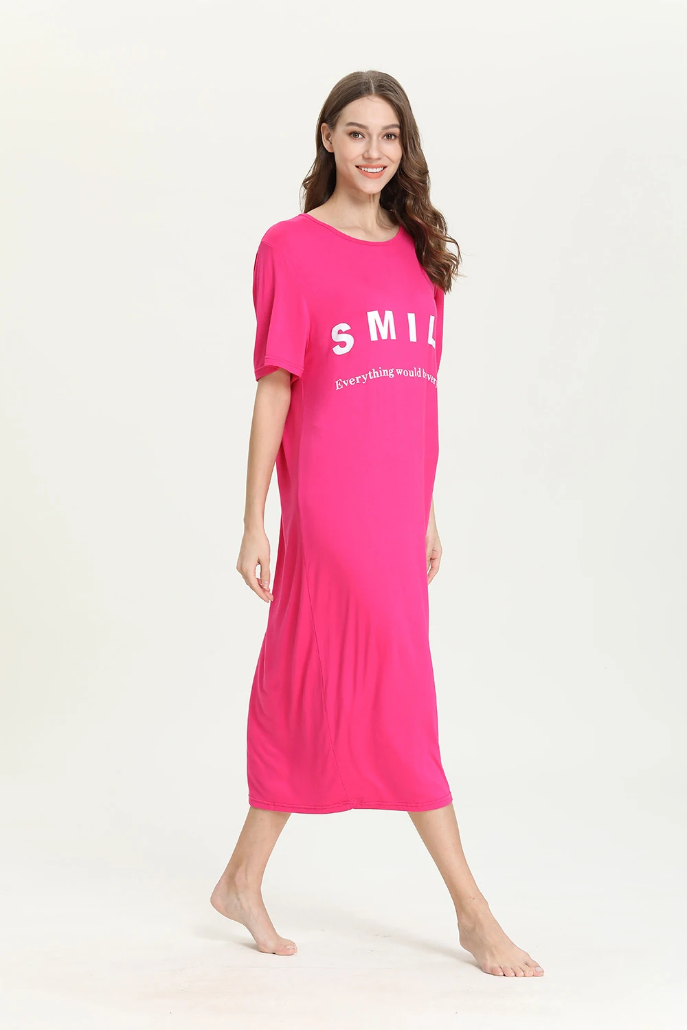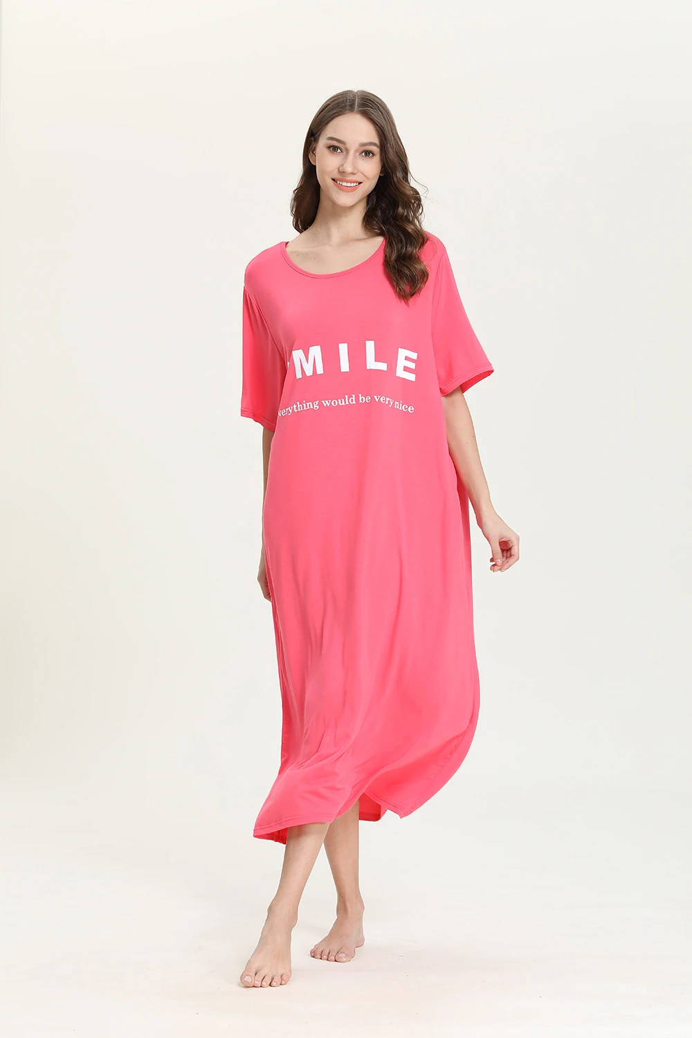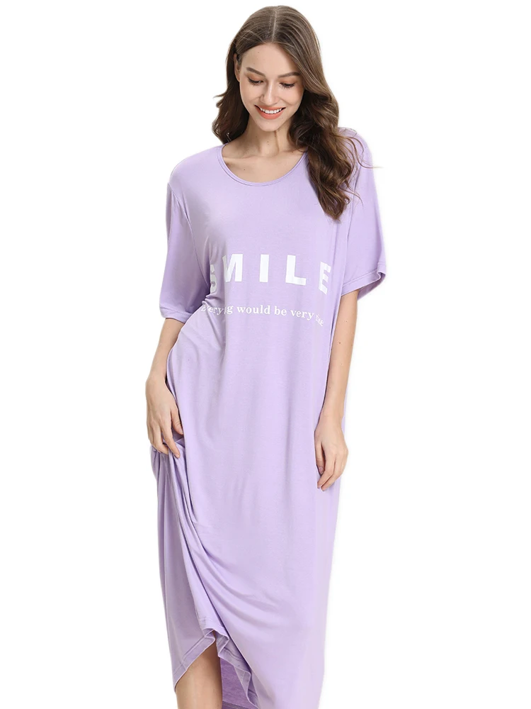 Большие размеры милой улыбкой Длинные свободные женская одежда для сна, ночное платье, удобные модельные свободное платье средней длинны с коротким рукавом для женщин sleepdress