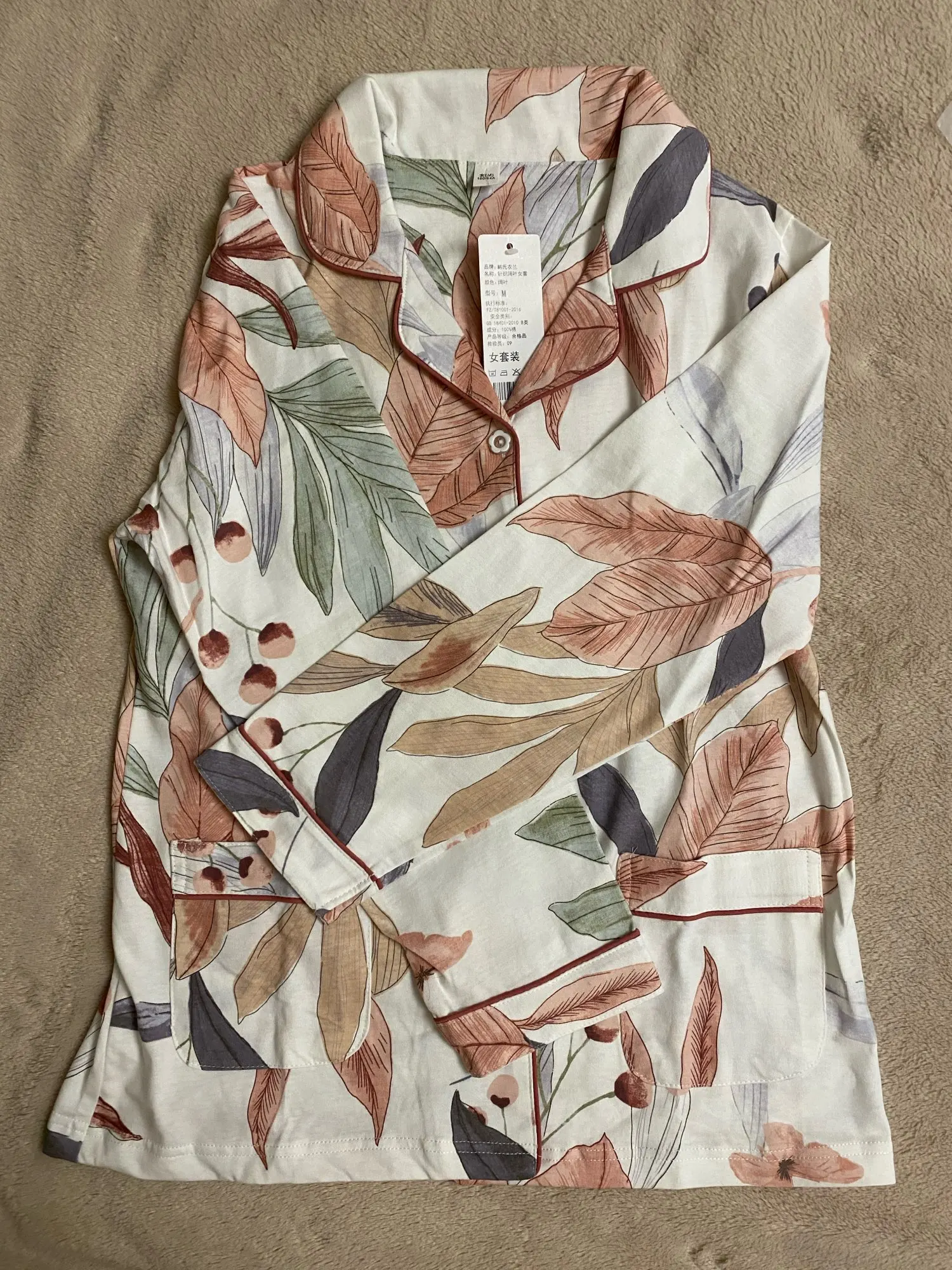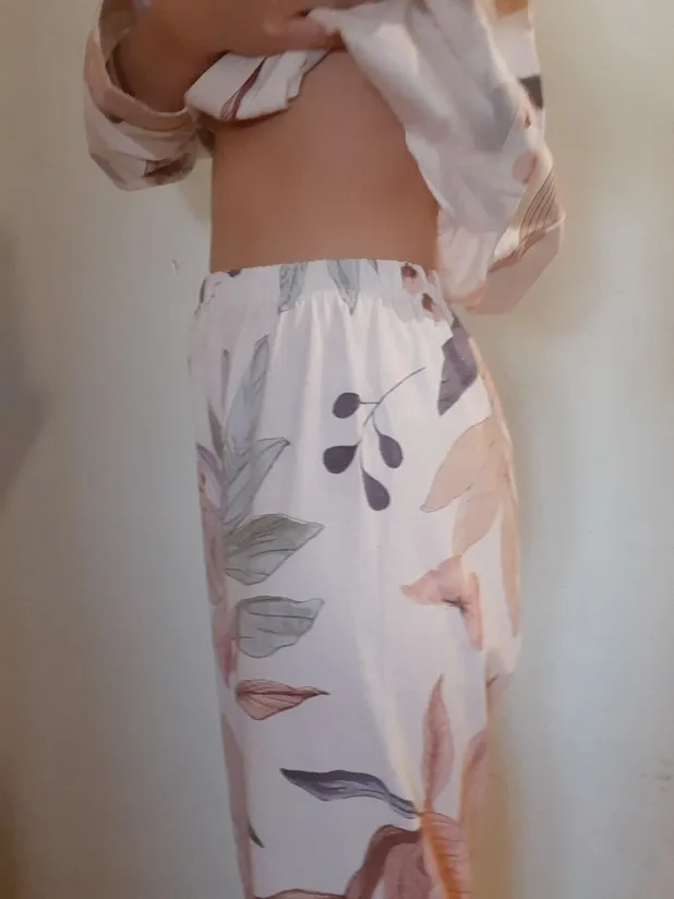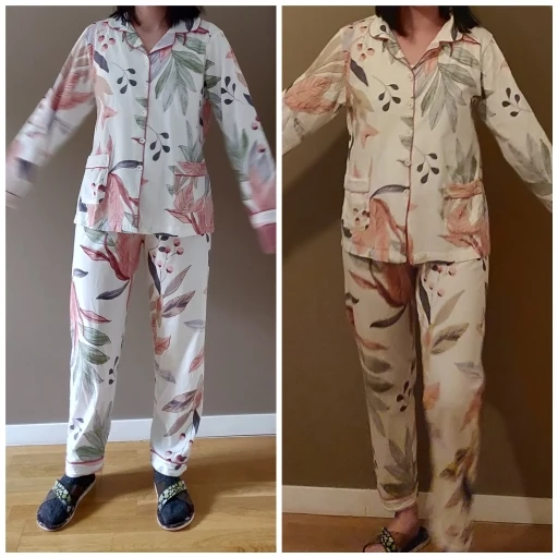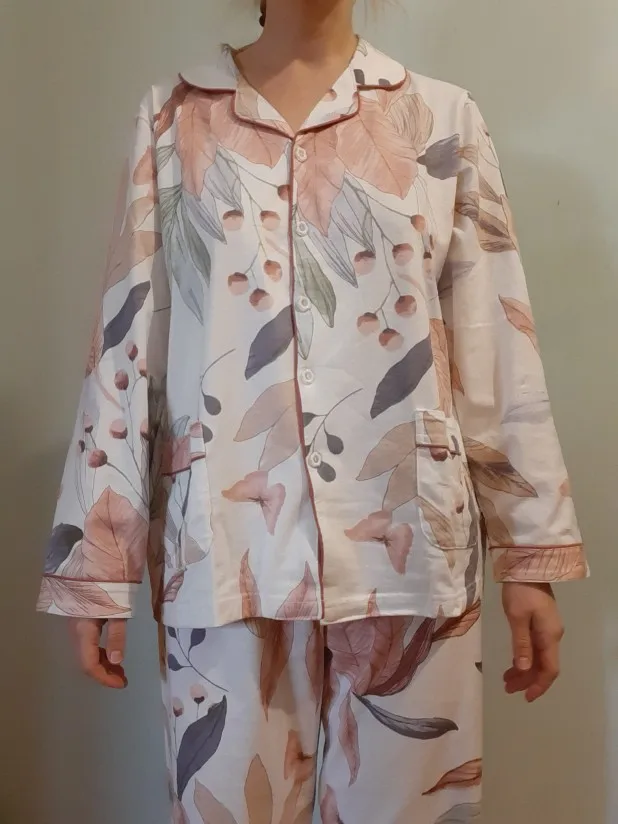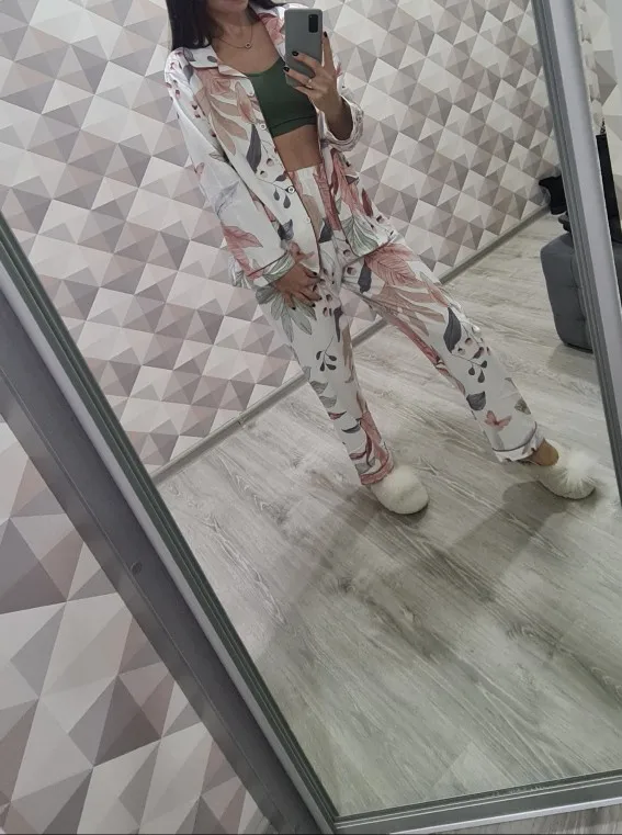 Заказала по отзывам размер больше, так как многие пишут, что после стирки может тать усадку. На российский 40-42 взяла L, достаточно просторно сидит. Цвет пижамы соответствует фото, ткань просвечивается, под кофту нужно будет одевать топ.