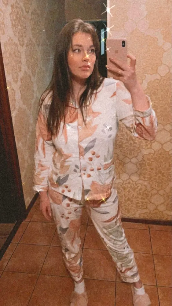 Пижама красивая, плотный трикотаж. Расцветка приглушенная, не такая розовая, ка на фото. На мой 42 размер и рост 158см взяла М. Сидит свободно и не висит в плечах. Ещё не стирала.
