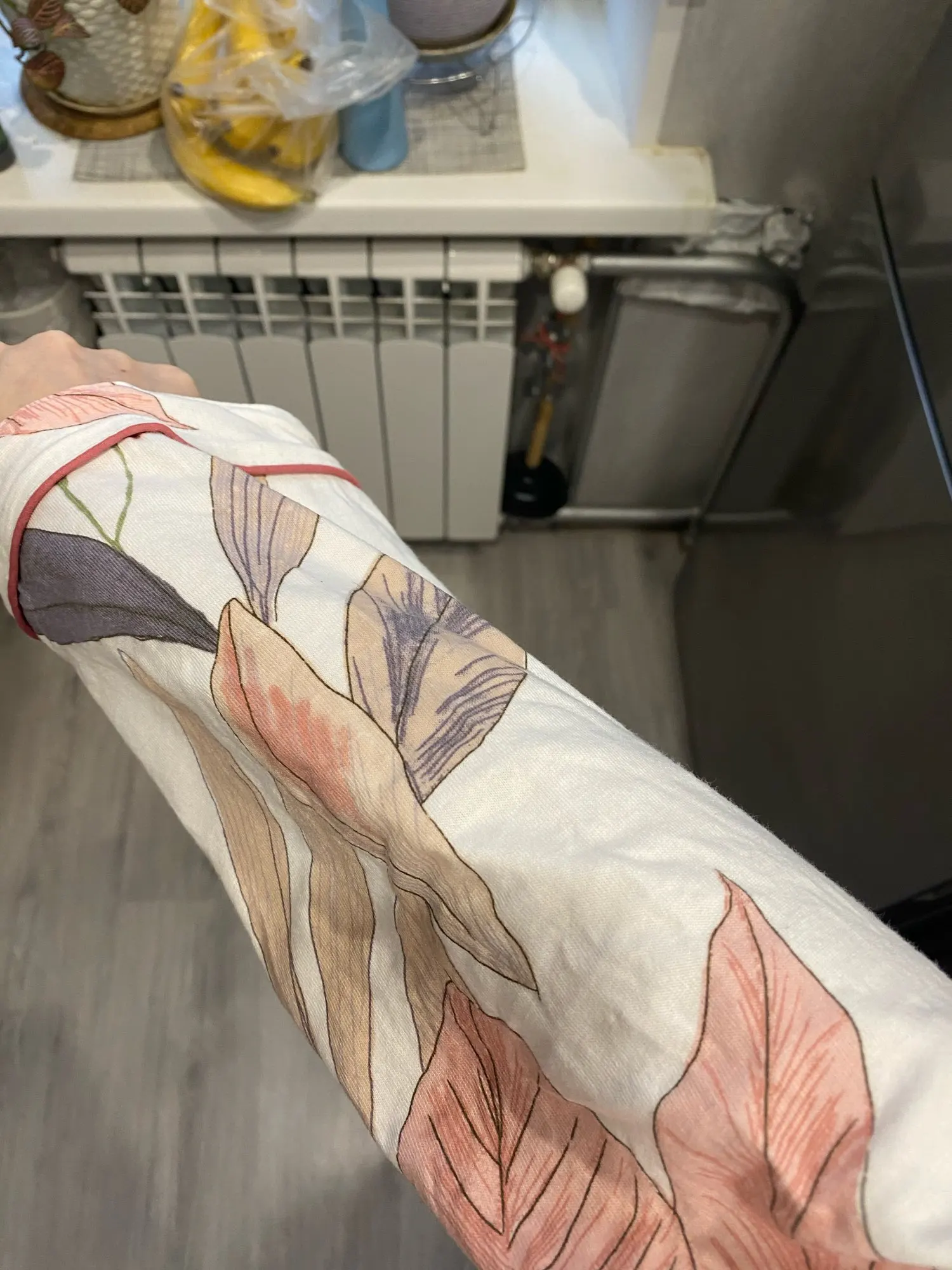 Описание было точным, неточными скорее были отзывы. Кто-то сравнивал пижаму с Ойшо, но здесь ткань скорее как в Чебоксарском трикотаже. Толстый трикотаж, рисунок красивый, смотрится хорошо, комфортная, но синтетика похоже присутствует, потому что в ней очень жарко. Пуговицы не очень красивые в виде цветочков, дешевит.