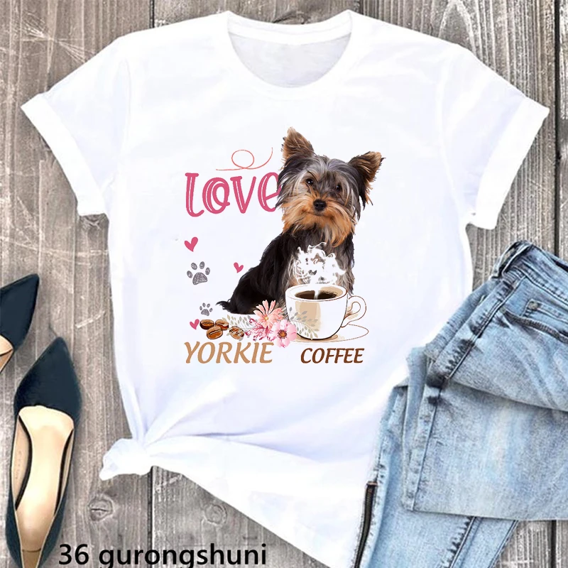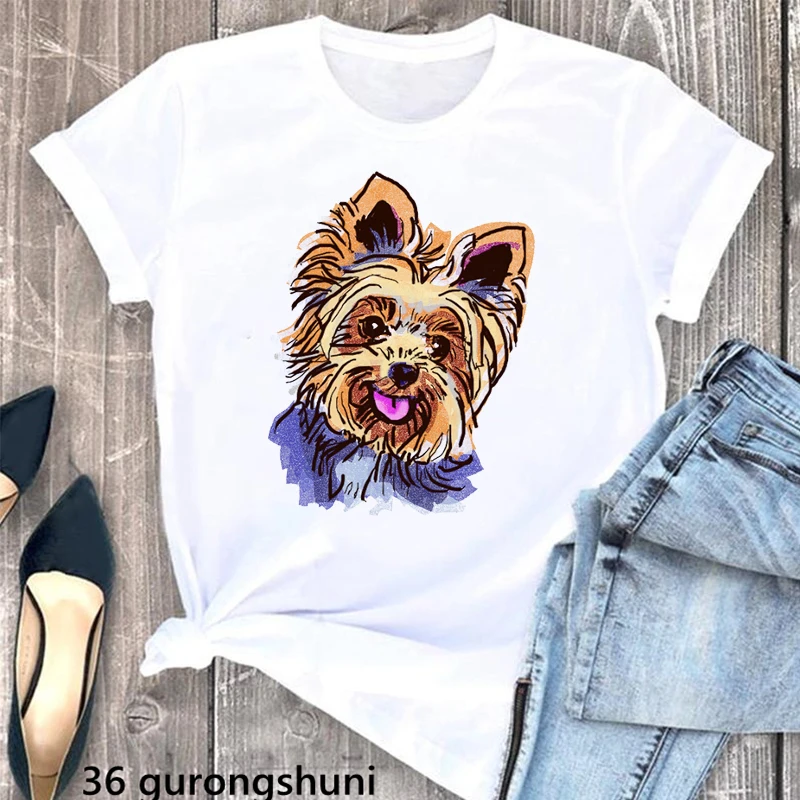 Футболка женская белая, с принтом щенка йоркширского терьера, в сти...