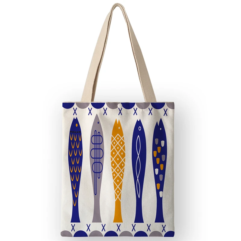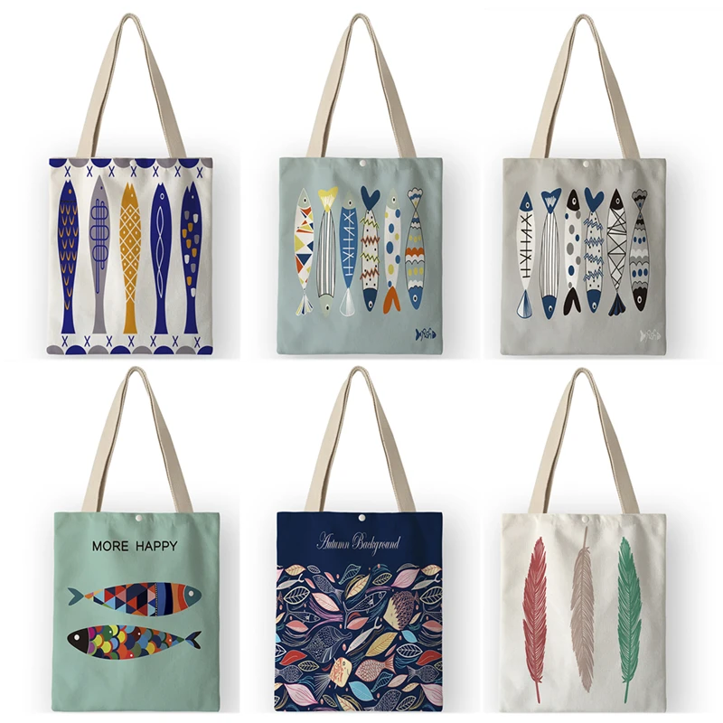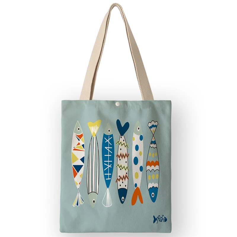 Корейская модная Холщовая Сумка AKB01066 на плечо, женские сумки, индивидуальные сумки для покупок с принтом рыбы, большой вместимости с карманами