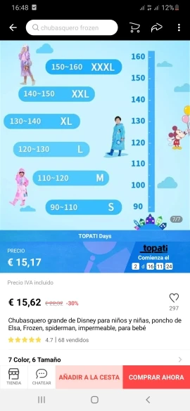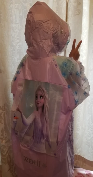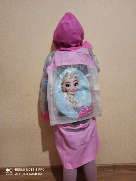 Хороший дождевик, как клеенчатые обложки для книг. Матовый такой. На рост 100см размер S велик и прилично так. Этот размер где то на рост 110 хорошо будет, но мы уже носили подвернув манжеты, нам как плащик он, достаёт до верха резиновых сапог почти. Край капюшона надувается, можно ходить без зонта! Упаковано хорошо в фирменный зип-лок, есть голограмма disney, не знаю что это видимо есть права на использование. , пришло очень быстро в постамат. Не знаю надолго ли хватит его. Т.к материал этот легко порвать, но если ходить аккуратно то думаю прослужит какое то время, надеюсь на год хватит с периодическими использованиями