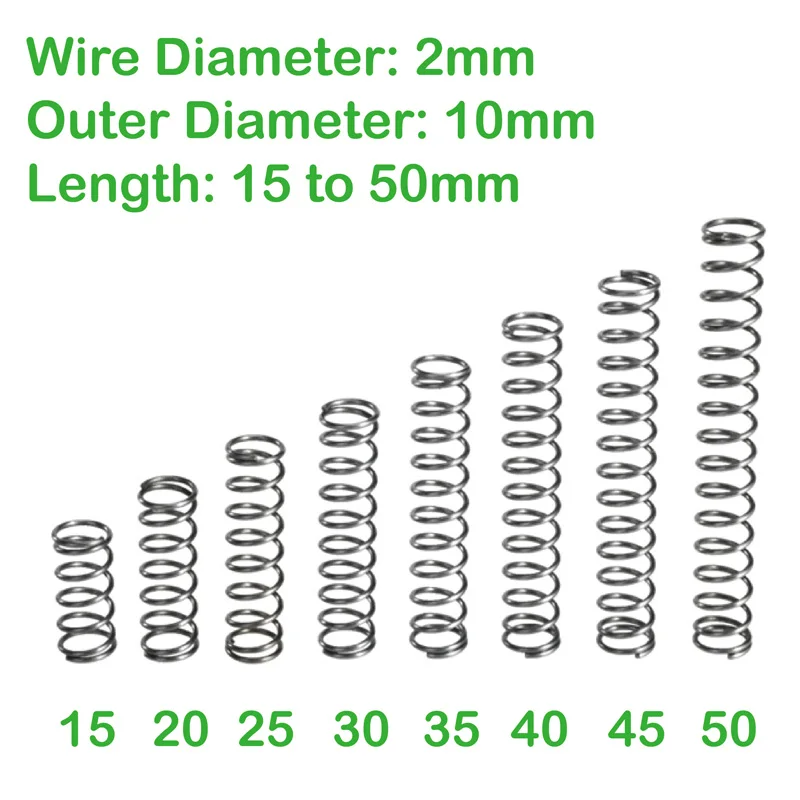 Маленькие пружины сжатия, диаметр проволоки 2 мм, внешний диаметр 10 мм, длина от 15 мм до 50 мм