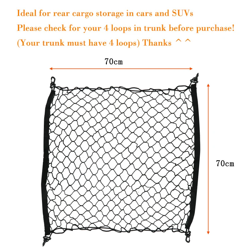 1. Название: Универсальная эластичная нейлоновая сетка для багажника автомобиля 2. Материал: ткань нейлон пластик 3. Цвет: черный 4. Размер: 70 см * 70 см 5. Модель автомобиля: Универсальный (требуется 4 Крючки для багажника) примечания по установке: Проверьте, есть ли в автомобиле 4 крючка; Пожалуйста, проверьте перед размещением заказа. Посылка входит: 1 эластичная нейлоновая сетка для багажника автомобиля (с 4 крючками)