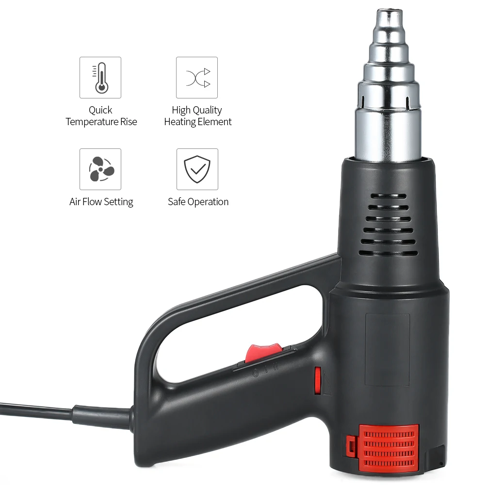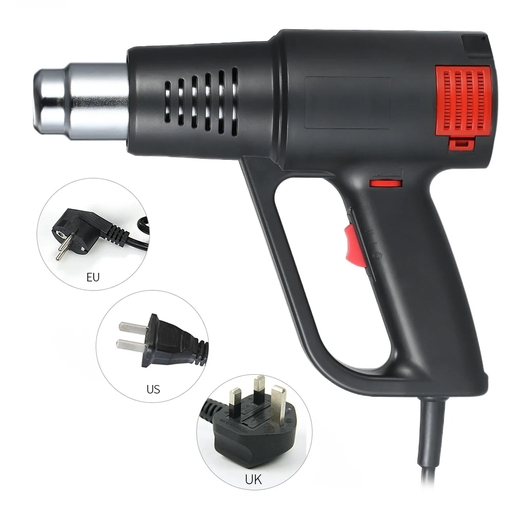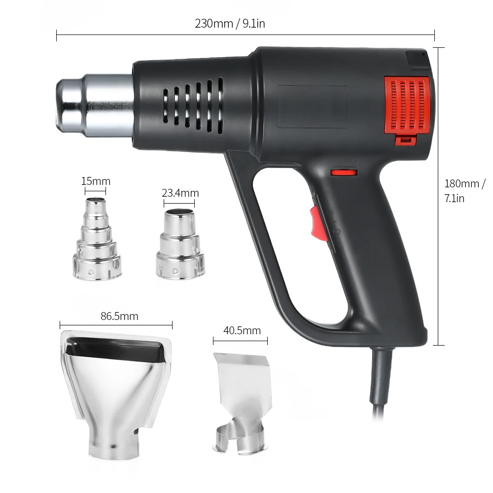 Этот пистолет горячего воздуха с высокой производительностью и долгим сроком службы плавная регулировка температуры. Высококачественные Нагревательные элементы обеспечивают надежную и безопасную работу, быстро и точно нагреваются, используется для многих целей: ослабления винтов, гибки пластиковых труб, удаления краски и т. д.Характеристика:Бесступенчатая регулировка температуры: 60 °-590 °, легко регулируется термилизатором типа ролика.С 4 различными насадками, удовлетворяя ваши различные потребности в нагреве.Компактный размер, портативный для использования. 2 регулируемых типа воздушного потока: 250 л/мин или 550 л/мин.Со съемной пылезащитной сеткой для легкой и удобной очистки.Может быть применен в паяльных трубах, сварочных ПВХ, сушильных, термоусадочных, зачистки краски и т. Д.Термостойкая Черная передняя крышка защищает ваши руки от ожогов.Высококачественные Нагревательные элементы обеспечивают надежную и безопасную работу.Характеристики:Тип вилки: ЕС/США(Опционально)Материал: АБС-пластикВходное напряжение: AC220-240V (штепсельная вилка ЕС) / AC100-120V (штепсельная вилка США), 50-60 ГцВыходная мощность: 1800-2000 ВтБесступенчатая регулировка температуры: 60 °-590 °Поток воздуха:Ⅰ: 250 л/минⅡ: 550L/минПрименение: Удалите краску, очистите старые обои, удалите пластиковую напольную плитку, согните ПВХ трубу, расплавьте мусор в трубе, удалите жирный мусор, термоусадочную упаковочную пленку и трубку, выдуйте остатки нити одежды в производстве одеждыРазмер изделия: прибл. 230*180*72 мм/9,1*7,1*2,8 дюймовВес изделия: прибл. 596 г/21,0 унцийЧехол Размеры: прибл. 27,5*26*7,5 см/10,8*10,2 * 3.0inВес посылка: прибл. 915 г/32,3 унцийПримечание:Не прикасайтесь к соплу после или в работе.Держите подальше от детей.Не используйте для фена.Не направляйте тепло к людям или животным.Не используйте его во влажном состоянии.Фокусировка при работе.Посылка:1 * пистолет горячего воздуха1*3 слоя сопла1*5 слоев сопла1 * плоское сопло1 * сопло термоусадочной трубки1 * Руководство пользователя