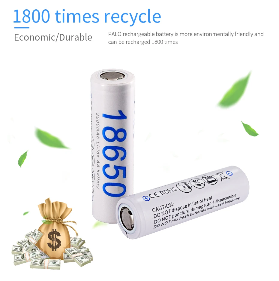 Аккумуляторная батарея PALO 18650 является более экологически безопасной, батарея изготовлена из литий-ионного материала, низкого саморазряда, без памяти и может быть заряжена в любое время. И может быть перезаряжен в 1800 раз, Сэкономьте больше денег, чем одноразовые батареи.
