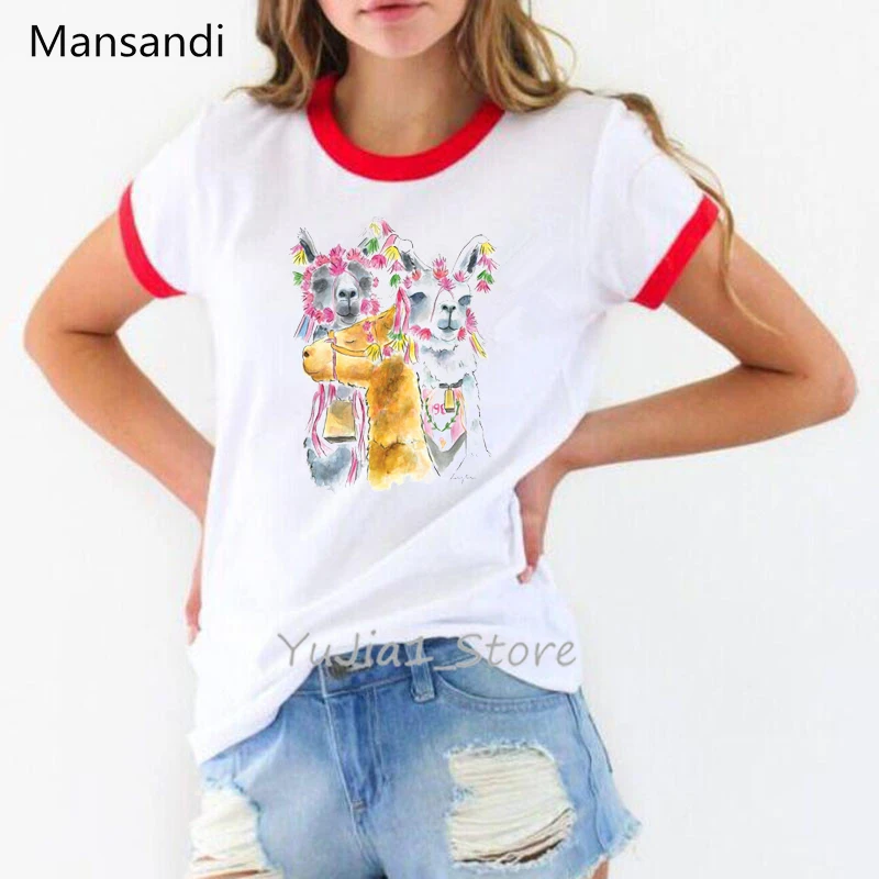 Женская летняя одежда 2021, акварельная Цветочная альпака, футболка с животным принтом, женские топы, кавайные футболки в стиле Харадзюку, футболка с рисунком tumblr