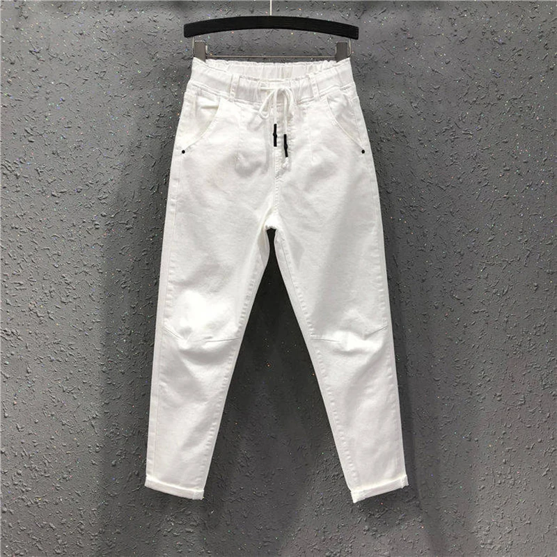 Женские джинсы-шаровары, хлопковые, желтого и белого цветов, на резинке, лето, D321, размера плюс