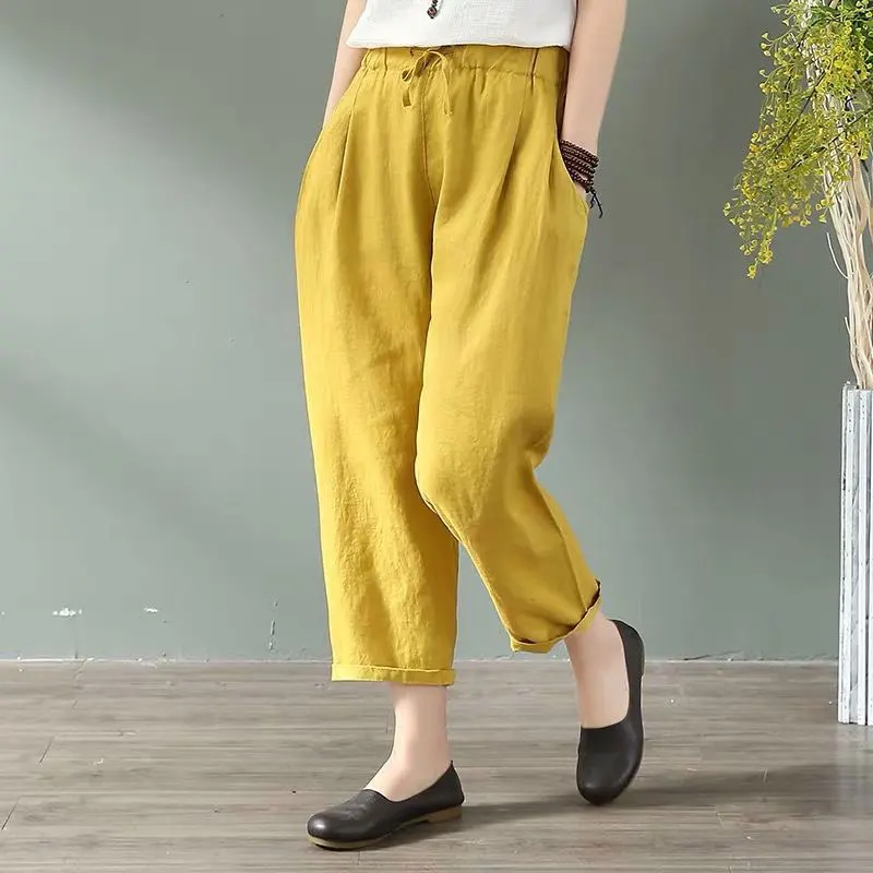 Брючки летние, тонкий материал, хлопок. Цвет скорее горчичный, а не жёлтый. Пояс на резинке, поэтому хорошо садятся. 3XL отлично подошли на рос.54.