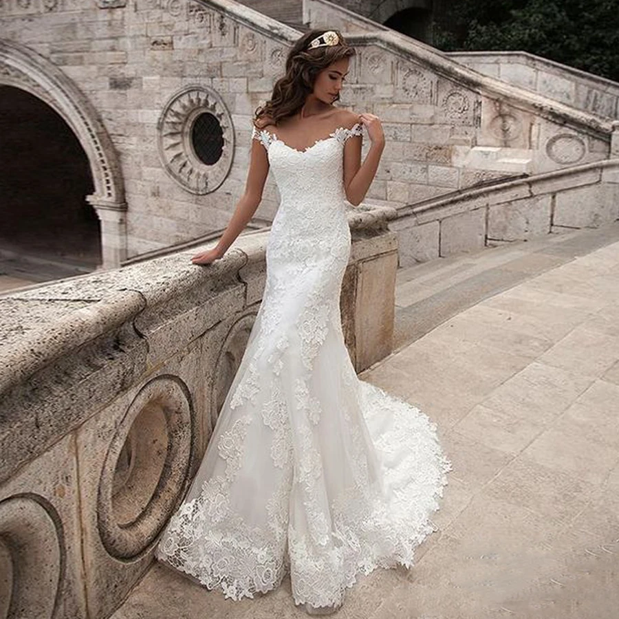 Тюль совок декольте кружева Цветы Русалка приталенный силуэт свадебное платье с иллюзией пуговицы сзади суд Поезд аппликация для платья невесты