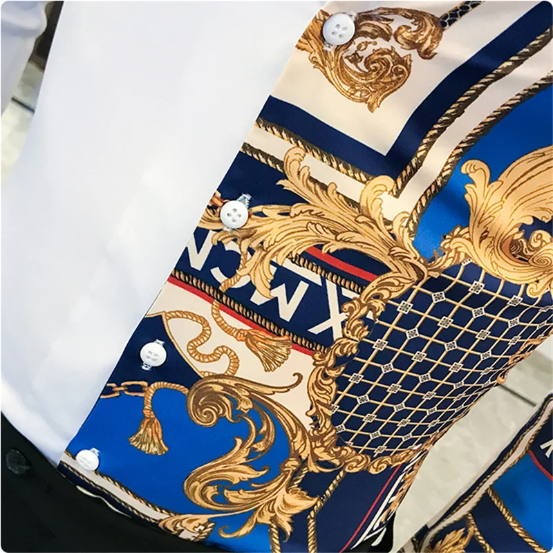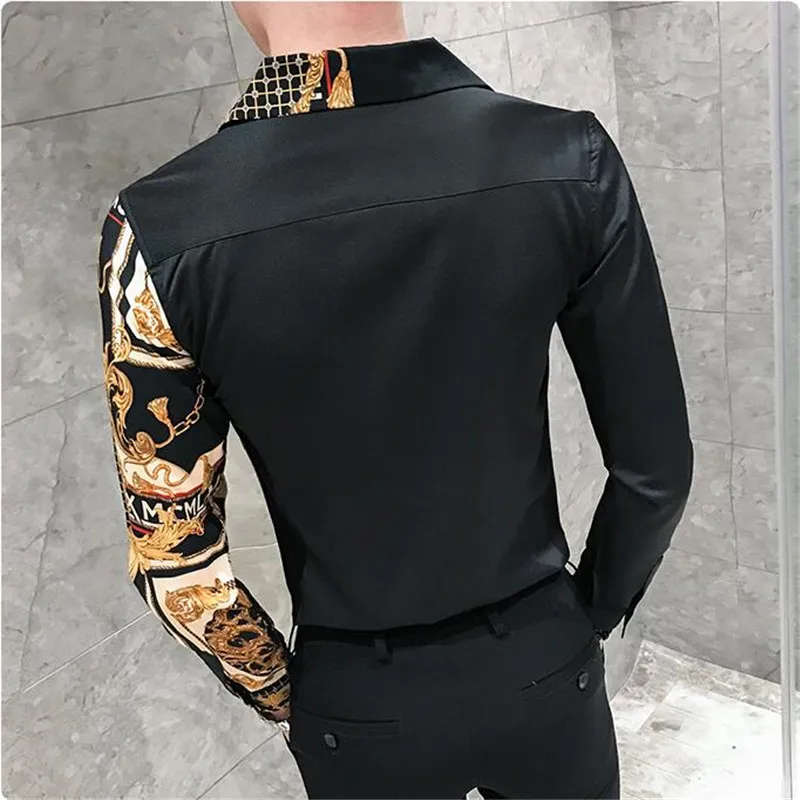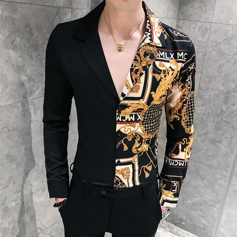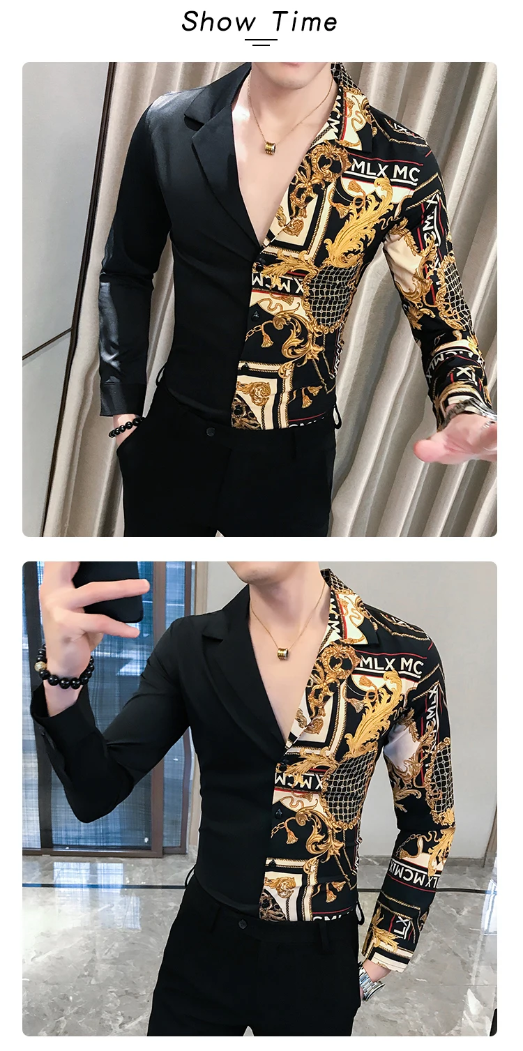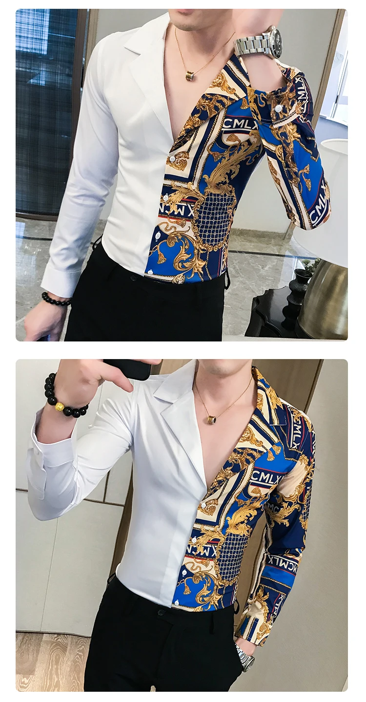 Рубашка с глубоким V-образным вырезом, новинка 2019, Клубная одежда, приталенная рубашка в стиле барокко с длинными рукавами, в стиле пэчворк, модная Мужская Дизайнерская брендовая рубашка с принтом