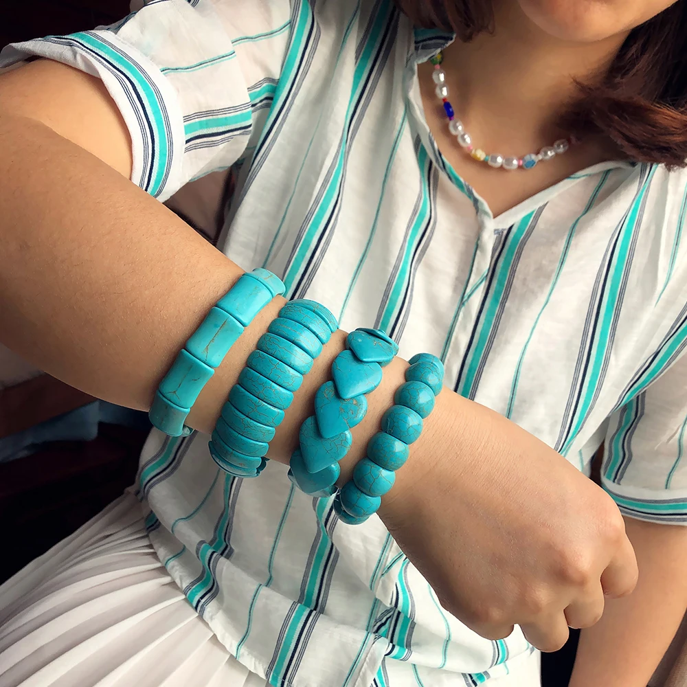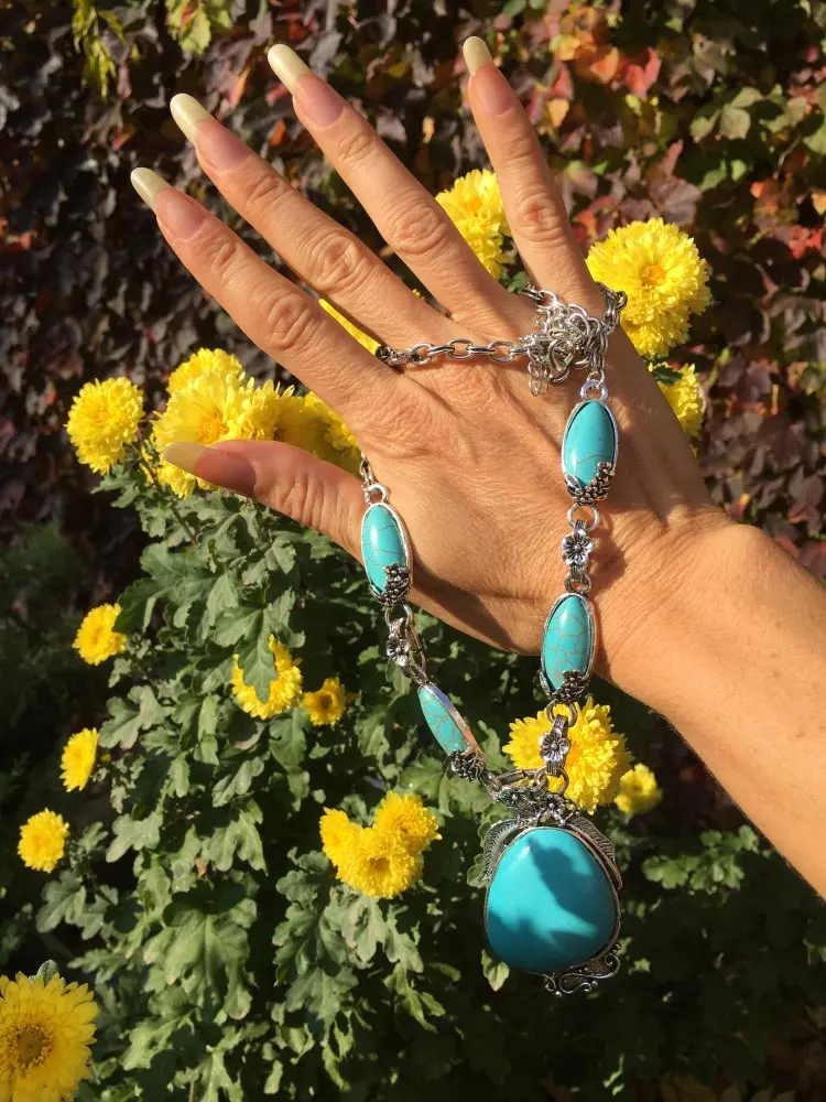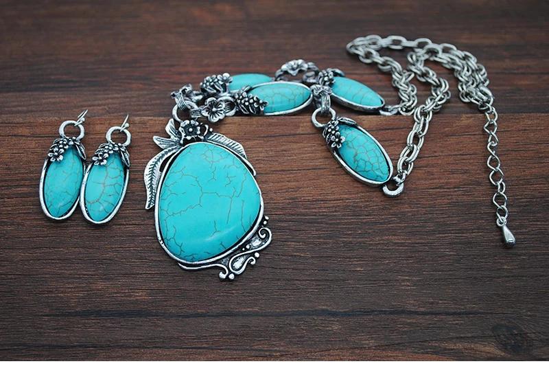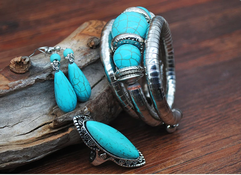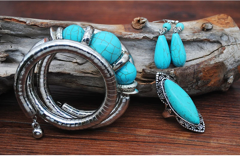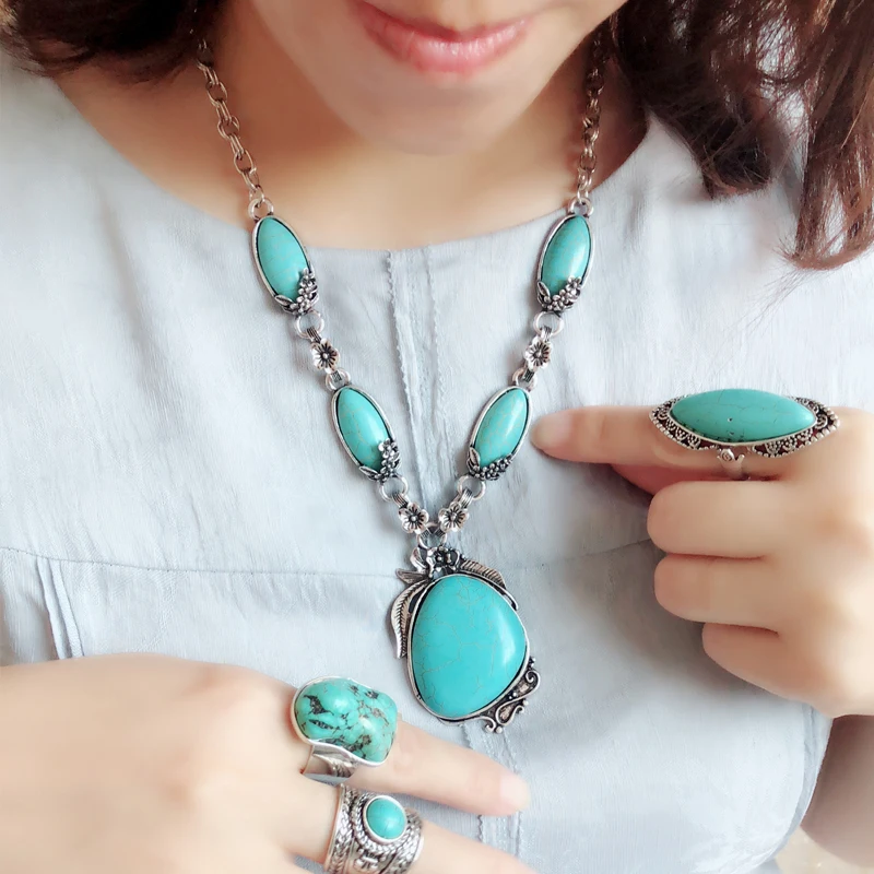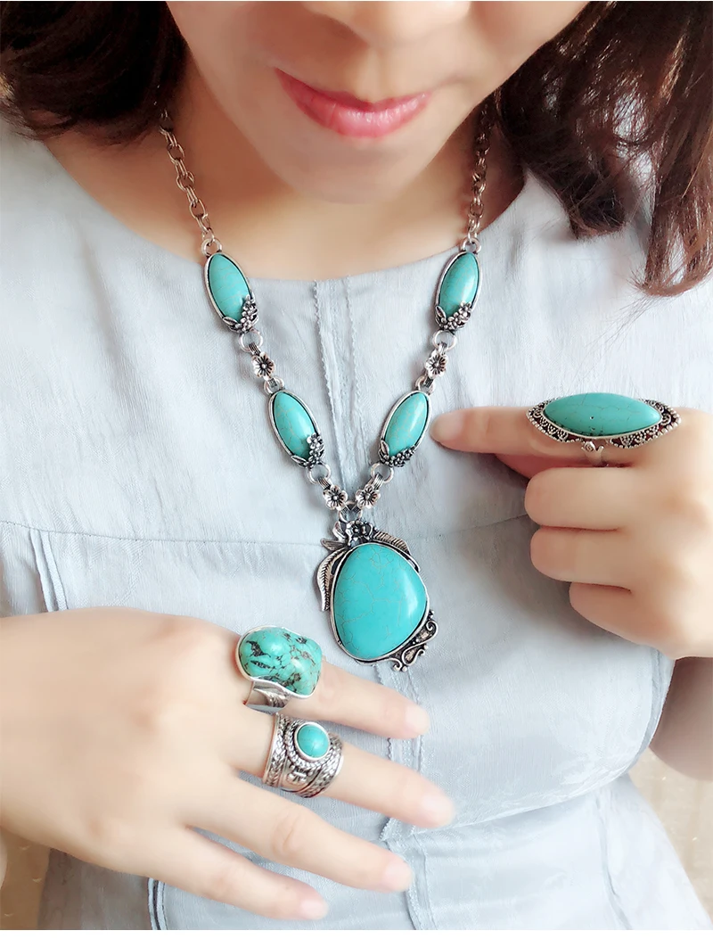 Женский комплект бирюзовых украшений Yumfeel, винтажный посеребренный комплект из ожерелья, браслета, серег, кольца