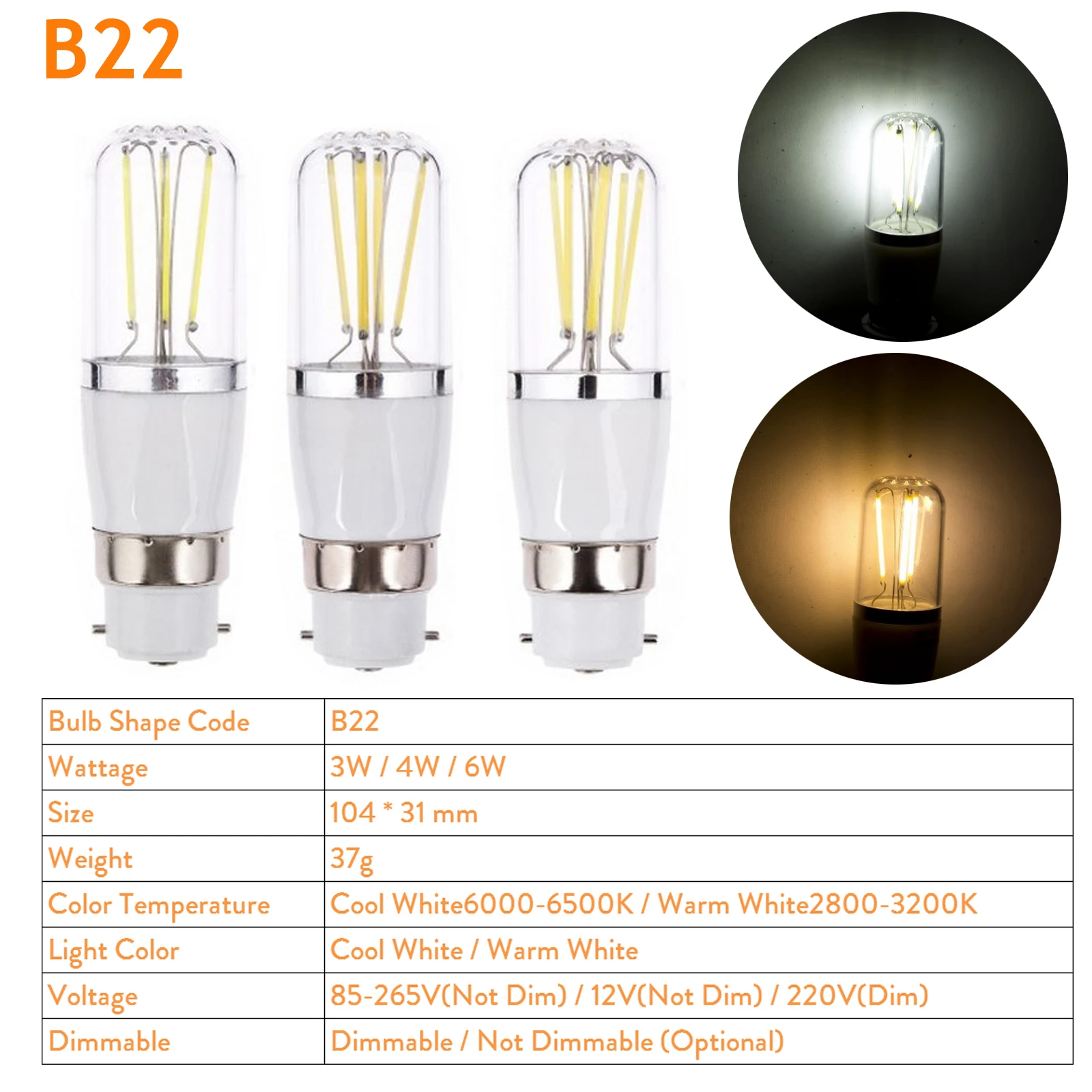E14 E27 3W 4W 6W Светодиодный светильник накаливания, диммируемая B22 байонетная Замена 30W 40W 60W лампа накаливания 220V 110V DC 12V