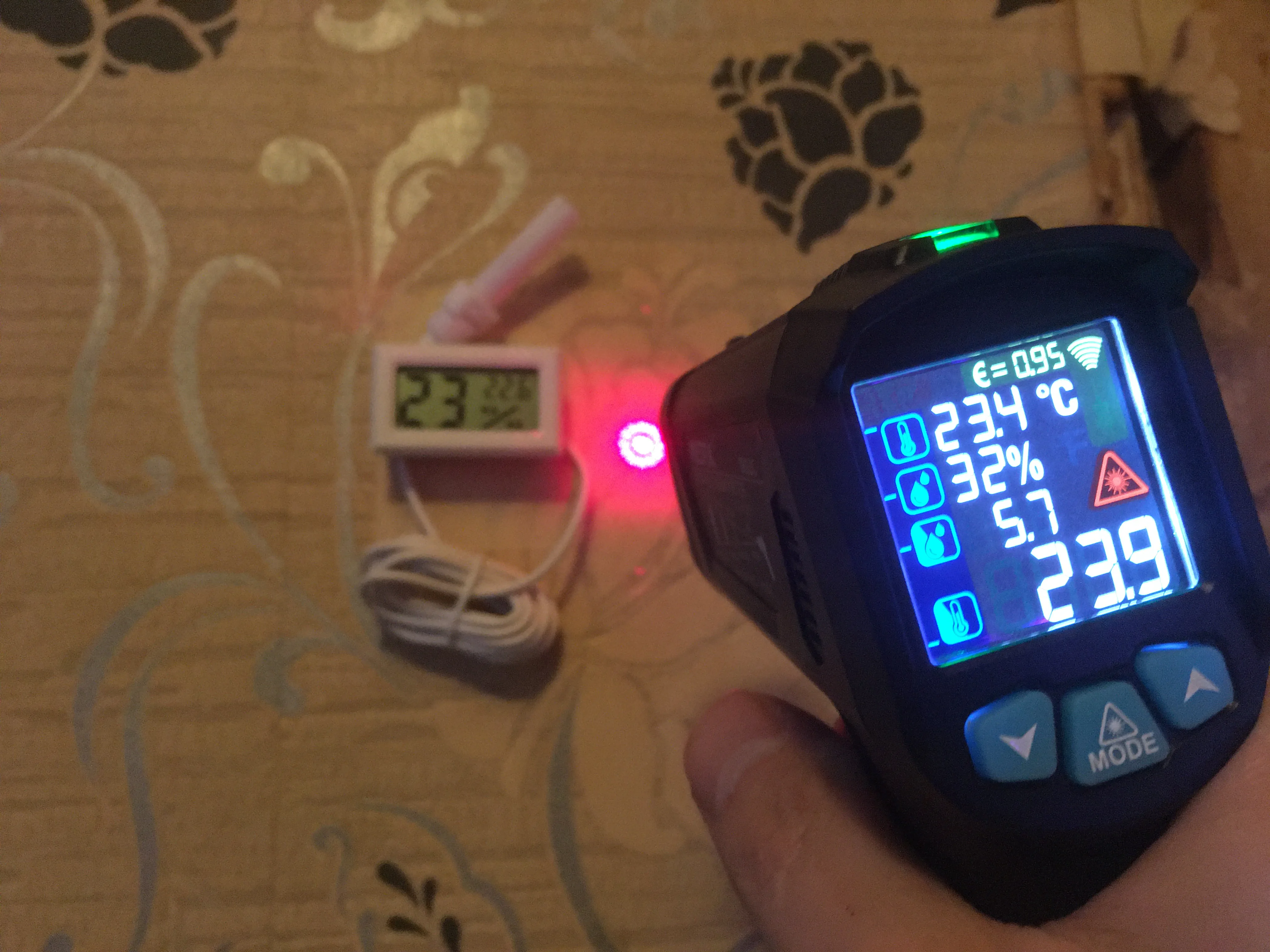 термометром доволен. щуп в вскипеченом чайнике показывает 98-99 градусов. температуру тела мерить не заточен, но если подобрать коэффициент (для каждого он уникален), то можно приблизительно понимать сколько градусов (погрешность 0.2-0.5 градуса). влажность показывает, как и гигрометр в комнате. температуру в комнате показывает выше чем ксяоми станция, но если измерить данным термометром место рядом с станцией, то температура совпадает. нужно менять коэффициент к каждой поверхности. проверял на стекле на подоконнике и ДСП на балконе (на стекле лежал ещё мелкий термометр сяоми, на балконе лежит ртутный уличный градусник) сабж показал значения отличные на 0.1-0.3 градуса, что считаю достойным показателем. мерить лазером кипящую воду бессмысленно, из-за паров будет показывать градусов 50-80