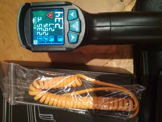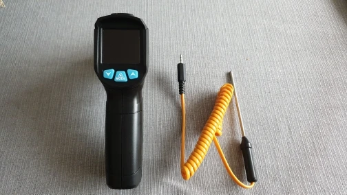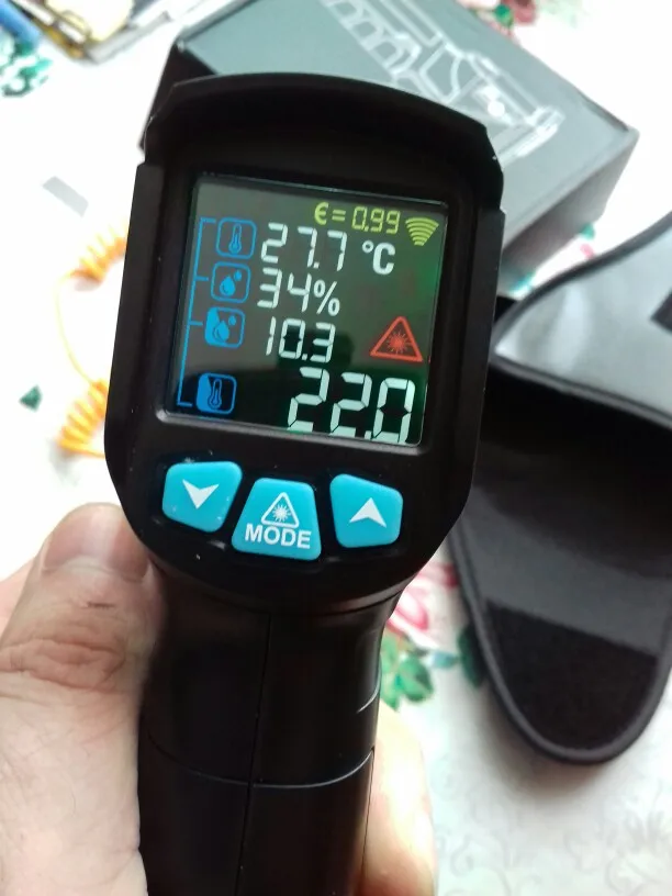 Удобный, красивый. Показывает всё очень приблизительно. Наверное надо точно указывать коэффициент теплового излучения, который по умолчанию установлен 0,95. Просто нажать кнопку и получить результат с точностью хотя бы 2 градуса не получиться. Кипящая вода 95-97 градусов, через термодатчик - 97 градусов. Температуру окружающего воздуха показывает на 3 градуса выше, влажность плюс-минус 5%.