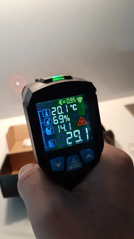 Извините. Я разочарован. При распаковке на дисплее не было прозрачных пленок. Как будто клиент уже получил его и вернул его. Не возражаю, если это сработает. Инфракрасный термометр не откалиброван. Он показывает по-разному в диапазоне низких температур, чем в верхней части. Ненадежный. Температура летит вверх/вниз. Температура должна быть одинаковой даже после повторных измерений. Я сравнил его с кипящей водой 100C. Второй ZT-X термометра показывает 99-100C. Этот IR02C, датчик k-типа показывает 106C и ИК-датчик 78-92 C Макс. Я следовал инструкциям. Думаю, мне не понравилось это изделие. AliExpress Вернула все деньги, поэтому 5 звезд.